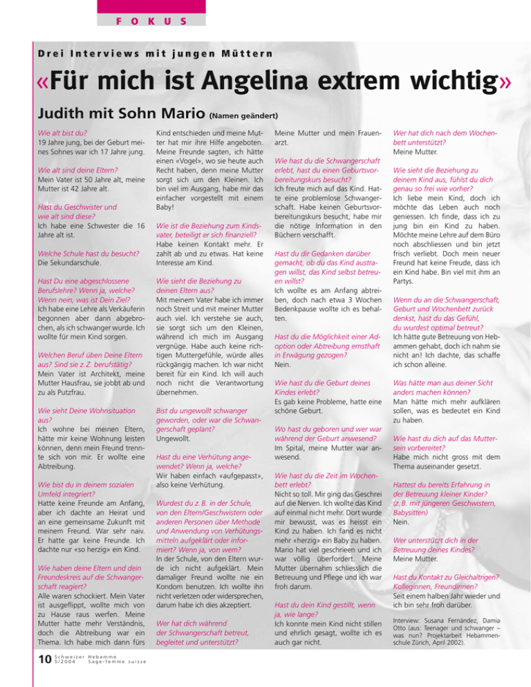 F O K U S Drei Interviews mit jungen Müttern «Für mich ist Angelina extrem wichtig» Judith mit Sohn Mario (Namen geändert) Wie alt bist du? 19 Jahre jung, bei der Geburt meines Sohnes war ich 17 Jahre jung. Wie alt sind deine Eltern? Mein Vater ist 50 Jahre alt, meine Mutter ist 42 Jahre alt. Hast du Geschwister und wie alt sind diese? Ich habe eine Schwester die 16 Jahre alt ist. Welche Schule hast du besucht? Die Sekundarschule. Hast Du eine abgeschlossene Berufslehre? Wenn ja, welche? Wenn nein, was ist Dein Ziel? Ich habe eine Lehre als Verkäuferin begonnen aber dann abgebrochen, als ich schwanger wurde. Ich wollte für mein Kind sorgen. Welchen Beruf üben Deine Eltern aus? Sind sie z. Z. berufstätig? Mein Vater ist Architekt, meine Mutter Hausfrau, sie jobbt ab und zu als Putzfrau. Wie sieht Deine Wohnsituation aus? Ich wohne bei meinen Eltern, hätte mir keine Wohnung leisten können, denn mein Freund trennte sich von mir. Er wollte eine Abtreibung. Wie bist du in deinem sozialen Umfeld integriert? Hatte keine Freunde am Anfang, aber ich dachte an Heirat und an eine gemeinsame Zukunft mit meinem Freund. War sehr naiv. Er hatte gar keine Freunde. Ich dachte nur «so herzig» ein Kind. Wie haben deine Eltern und dein Freundeskreis auf die Schwangerschaft reagiert? Alle waren schockiert. Mein Vater ist ausgeflippt, wollte mich von zu Hause raus werfen. Meine Mutter hatte mehr Verständnis, doch die Abtreibung war ein Thema. Ich habe mich dann fürs 10 Schweizer Hebamme 5/2004 Sage-femme suisse Kind entschieden und meine Mutter hat mir ihre Hilfe angeboten. Meine Freunde sagten, ich hätte einen «Vogel», wo sie heute auch Recht haben, denn meine Mutter sorgt sich um den Kleinen. Ich bin viel im Ausgang, habe mir das einfacher vorgestellt mit einem Baby! Wie ist die Beziehung zum Kindsvater, beteiligt er sich finanziell? Habe keinen Kontakt mehr. Er zahlt ab und zu etwas. Hat keine Interesse am Kind. Wie sieht die Beziehung zu deinen Eltern aus? Mit meinem Vater habe ich immer noch Streit und mit meiner Mutter auch viel. Ich verstehe sie auch, sie sorgt sich um den Kleinen, während ich mich im Ausgang vergnüge. Habe auch keine richtigen Muttergefühle, würde alles rückgängig machen. Ich war nicht bereit für ein Kind. Ich will auch noch nicht die Verantwortung übernehmen. Bist du ungewollt schwanger geworden, oder war die Schwangerschaft geplant? Ungewollt. Hast du eine Verhütung angewendet? Wenn ja, welche? Wir haben einfach «aufgepasst», also keine Verhütung. Wurdest du z. B. in der Schule, von den Eltern/Geschwistern oder anderen Personen über Methode und Anwendung von Verhütungsmitteln aufgeklärt oder informiert? Wenn ja, von wem? In der Schule, von den Eltern wurde ich nicht aufgeklärt. Mein damaliger Freund wollte nie ein Kondom benutzen. Ich wollte ihn nicht verletzen oder widersprechen, darum habe ich dies akzeptiert. Wer hat dich während der Schwangerschaft betreut, begleitet und unterstützt? Meine Mutter und mein Frauenarzt. Wie hast du die Schwangerschaft erlebt, hast du einen Geburtsvorbereitungskurs besucht? Ich freute mich auf das Kind. Hatte eine problemlose Schwangerschaft. Habe keinen Geburtsvorbereitungskurs besucht, habe mir die nötige Information in den Büchern verschafft. Hast du dir Gedanken darüber gemacht, ob du das Kind austragen willst, das Kind selbst betreuen willst? Ich wollte es am Anfang abtreiben, doch nach etwa 3 Wochen Bedenkpause wollte ich es behalten. Hast du die Möglichkeit einer Adoption oder Abtreibung ernsthaft in Erwägung gezogen? Nein. Wie hast du die Geburt deines Kindes erlebt? Es gab keine Probleme, hatte eine schöne Geburt. Wo hast du geboren und wer war während der Geburt anwesend? Im Spital, meine Mutter war anwesend. Wie hast du die Zeit im Wochenbett erlebt? Nicht so toll. Mir ging das Geschrei auf die Nerven. Ich wollte das Kind auf einmal nicht mehr. Dort wurde mir bewusst, was es heisst ein Kind zu haben. Ich fand es nicht mehr «herzig» ein Baby zu haben. Mario hat viel geschrieen und ich war völlig überfordert. Meine Mutter übernahm schliesslich die Betreuung und Pflege und ich war froh darum. Hast du dein Kind gestillt, wenn ja, wie lange? Ich konnte mein Kind nicht stillen und ehrlich gesagt, wollte ich es auch gar nicht. Wer hat dich nach dem Wochenbett unterstützt? Meine Mutter. Wie sieht die Beziehung zu deinem Kind aus, fühlst du dich genau so frei wie vorher? Ich liebe mein Kind, doch ich möchte das Leben auch noch geniessen. Ich finde, dass ich zu jung bin ein Kind zu haben. Möchte meine Lehre auf dem Büro noch abschliessen und bin jetzt frisch verliebt. Doch mein neuer Freund hat keine Freude, dass ich ein Kind habe. Bin viel mit ihm an Partys. Wenn du an die Schwangerschaft, Geburt und Wochenbett zurück denkst, hast du das Gefühl, du wurdest optimal betreut? Ich hätte gute Betreuung von Hebammen gehabt, doch ich nahm sie nicht an! Ich dachte, das schaffe ich schon alleine. Was hätte man aus deiner Sicht anders machen können? Man hätte mich mehr aufklären sollen, was es bedeutet ein Kind zu haben. Wie hast du dich auf das Muttersein vorbereitet? Habe mich nicht gross mit dem Thema auseinander gesetzt. Hattest du bereits Erfahrung in der Betreuung kleiner Kinder? (z. B. mit jüngeren Geschwistern, Babysitten) Nein. Wer unterstützt dich in der Betreuung deines Kindes? Meine Mutter. Hast du Kontakt zu Gleichaltrigen? Kolleginnen, Freundinnen? Seit einem halben Jahr wieder und ich bin sehr froh darüber. Interview: Susana Fernández, Damia Otto (aus: Teenager und schwanger – was nun? Projektarbeit Hebammenschule Zürich, April 2002). Sanja 17-jährig mit Angelina 2 Monate (Namen nicht geändert) Wann hast Du gemerkt, dass Du schwanger bist? Ich hatte einen sehr unregelmässigen Zyklus und merkte in der 15. Schwangerschaftswoche), dass ich schwanger bin. Wie war Deine Reaktion darauf? Eigentlich konnte ich mir nie vorstellen, so früh Kinder zu haben. Zuerst wollte ich mich se