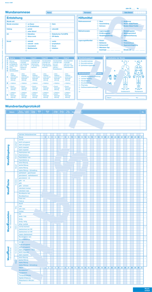 Version 1/2007 Jahr 20_____ Wundanamnese Name Vorname Entstehung Wunde seit Geb.Datum . . Hilfsmittel ____ . ____ . _______ Risikoassessment zu Hause Sturz Heim Ernährung Ausscheidung Norton-Skala Punkte ____ Schmerz Braden-Skala Punkte ____ MU ST ER Wunde erworben im Krankenhaus Heilung primär sekundär Maßnahmenplan unter Schorf Art © Diakonie-Pflege Verbund Berlin gGmbH | www.diakonie-pflege.de Nr. _________ Grund Dekubitus Diabetischer Fuß (DFS) Ulcus cruris OP-Narbe arteriell venös arteriell - venös lymphatisch traumatisch Druck Medikamente Infektion Lagerungshilfsmittel Lagerungsplan Bewegungsplan Ernährungsplan Miktionsprotokoll Hautpflegeplanung Schmerzerfassung Kissen Felle Bettdecke Fersenschoner Schaumstoff Superweichlagerung Matratzen-Typ: beantragt: ____ . ____ . _______ Grad Ia Grad Ib Grad II Grad III Grad IV Grad V Wundheilungsphasen Rötung / Entzündung an Epidermis sichtbar aber ohne sichtbaren Gewebsdefekt Gewebsdefekt innerhalb der Epidermis bzw. in die Epidermis reichend Gewebsdefekt innerhalb der Dermis bzw. in die Dermis reichend Gewebsdefekt innerhalb der Subcutis bzw. in die Subcutis reichend Gewebsdefekt innerhalb oder bis zum Faszien-, Sehnen-, Muskelbereich Gewebsdefekt innerhalb oder bis zum Knochen- oder Gelenksbereich G Exsudationsphase E Granulationsphase B Epithelisierungsphase A - ohne Infektion - ohne Durchblutungsstörung - ohne Infektion - ohne Durchblutungsstörung - ohne Infektion - ohne Durchblutungsstörung - ohne Infektion - ohne Durchblutungsstörung - ohne Infektion - ohne Durchblutungsstörung - ohne Infektion - ohne Durchblutungsstörung B + Infektion + Infektion + Infektion + Infektion + Infektion + Infektion Z U S T A N D Lokalisation der Wunde R + Durchblutungsstörung + Durchblutungsstörung + Durchblutungsstörung + Durchblutungsstörung + Durchblutungsstörung + Durchblutungsstörung D + Infektion + Durchblutungsstörung + Infektion + Durchblutungsstörung + Infektion + Durchblutungsstörung + Infektion + Durchblutungsstörung + Infektion + Durchblutungsstörung + Infektion + Durchblutungsstörung 1 2 4 20 21 7 47 41 arterielle Mangeldurchblutung venöser Blutstau Wundinfektion Druckbelastung Pharmaka Stoffwechselerkrankungen 42 43 48 49 45 51 46 52 23 24 9 25 31 32 28 10 8 53 26 13 11 27 14 17 50 44 R 22 12 R Wundheilungsstörungen (WHS) - L 5 6 1 2 3 4 5 6 7 8 L 3 L C Einsatz ab: ____ . ____ . _______ 33 37 34 38 29 30 35 39 15 18 19 16 40 36 Vorderansicht Rückansicht Datum: _____ . _____ . __________ Hz.: ________ © Kammerlander Wundverlaufsprotokoll Wund- Lokalinummer sation Datum Phase G/E/B WHS 1-7 Grad I-V Länge in mm Breite in mm Tiefe in mm Bemerkungen Hz. nächster Verbandswechsel Monat: 1 2 3 4 5 6 7 8 9 10 11 12 13 14 15 16 17 18 19 20 21 22 23 24 25 26 27 28 29 30 31 WundUmgebung Hautpflege? normal + leicht schuppend stark schuppend - leicht mazeriert Infektion? stark mazeriert Hautmykose nein + Hautmykose ja - Hautinfektion nein + Hautinfektion ja - Allergie? keine Reizung + leichte Rötung starke Rötung - starke Rötung + Schwellung epithelisiert - geschlossen WundFläche Wundstatus granulierend - epithelisierend + granulierend - rot gelb - rot gelb gelb - schwarz - nekrotisch trocken nekrotisch nass Wundtasche nein + Wundtasche ja - Fistel nein + Fistel ja + nass sehr nass - trocken klar + serös / trüb blutig - blutig / eitrig Infektion? VW = Verbandswechsel WundExsudation Milieu feucht eitrig / putride + normal riechend übelriechend bei VW - übelriechend vor VW massiv übelriechend Wundinfektion nein + Wundinfektion ja - Wundrandschutz? + leicht schuppend stark schuppend stark schuppend + rissig - leicht mazeriert stark mazeriert keine Reizung Allergie? 4 mm um die Wunde WundRand normal + leichte Rötung starke Rötung - starke Rötung + Schwellung Datum 1 2 3 4 5 6 7 8 9 10 11 12 13 14 15 16 17 18 19 20 21 22 23 24 25 26 27 28 29 30 31 Wundabstrich Hautabstrich Therapieänderung Digitale Erfassung Zeitaufwand in Minuten HZ Pflegeanamnese Wundverlauf außerordentliche Vorkommnisse Zeit Bericht Hz. Datum Zeit Bericht MU ST ER Datum Notizen Hz. Begriffserklärungen Chronische Wunde eine Wunde, die nach 6 Wochen konsequenter lokaler und ursachenbezogener Behandlung keine erkennbare Heilungstendenz zeigt Chronisch venöse Insuffizienz (CVI) klinische Manifestation eines Varizenleidens; Schlussunfähigkeit der Venenklappen und damit einhergehende Beeinträchtigung des venösen Rücktransportes des Blutes zum Herzen; die Rückstauung führt bei starker Ausprägung zum Ulcus cruris venosum (Stadium 3 nach Widmer) Diabetisches Fußgeschwür typischerweise an der Fußsohle im Vorfußbereich auftretendes Ulcus bei Klienten mit langjährig bestehendem Diabetes mellitus Epidermis oberste Schicht der Haut, auch Oberhaut genannt; mehrschichtig verhorntes Plattenepithel Epithel ein geschlossener Zellverband, der Körperoberflächen bedeckt Kolonisation Vermehrung von Mikroorganismen (noch) ohne Entzündungsreaktion des Körpers Kontamination Verunreinigung, hier durch Mikroorganismen Mazeration Aufweichen der Haut durch Feuchtigkeit; Haut verfärbt sich weißlich und ist aufgequollen Mesh Graft Maschentransplantat; ist ein Spalthauttransplantat, dass maschinell in ein Maschengitter umgewandelt wurde, um große Flächen mit Haut zu decken Narbenhypertrophie übermäßige Narbenbildung, die meistens durch starke Zugkräfte auf die Wunde entsteht Nekrose Veränderung einer Zelle nach dem Zelltod in einer Umgebung lebender Zellen Periost Knochenhaut, die Knochen umhüllt Primäre Wundheilung die glatten Wundränder werden z.B. durch eine chirurgische Naht in direkten Kontakt miteinander fixiert; das Ergebnis ist eine feine, strichförmige Narbe Primärverband Verband direkt auf der Wunde Putride Infektion Infektion durch Fäulniserreger Pyogene Infektion Infektion durch Eitererreger Regeneration eine Wunde wird gewebespezifisch durch neu hervorgebrachtes Gewebe gleichwertig ersetzt Reparation das verloren gegangene oder g