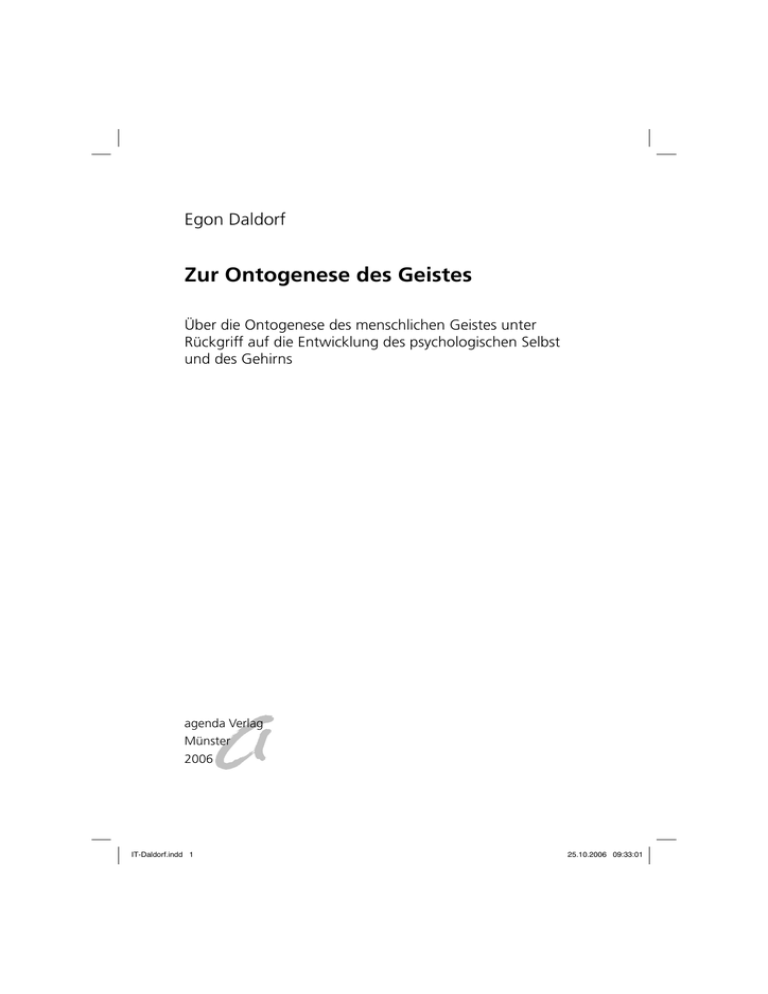 Egon Daldorf Zur Ontogenese des Geistes Über die Ontogenese des menschlichen Geistes unter Rückgriff auf die Entwicklung des psychologischen Selbst und des Gehirns agenda Verlag Münster 2006 IT-Daldorf.indd 1 25.10.2006 09:33:01 Bibliografische Information der Deutschen Nationalbibliothek Die Deutsche Nationalbibliothek verzeichnet diese Publikation in der Deutschen Nationalbibliografie; detaillierte bibliografische Daten sind im Internet unter http://dnb.d-nb.de abrufbar. © 2006 agenda Verlag GmbH & Co. KG Drubbel 4, D-48143 Münster Tel. +49-(0)251-799610 | Fax +49-(0)251-799519 [email protected] | www.agenda.de Umschlaggestaltung, Layout und Satz: Uta Walossek Druck und Bindung: SoWa, Warschau/PL ISBN-10: 3-89688-282-1 ISBN-13: 978-3-89688-282-0 IT-Daldorf.indd 2 25.10.2006 09:33:02 Zusammenfassung Die Untersuchung geht von der Auffassung aus, dass alles, was sich entwickelt, danach auch existiert. Aus einer systemtheoretisch-funktionalistischen Perspektive wird der Geist als Teil der internen Führungsinstanz oder Leiteinrichtung des Menschen definiert, seine Aufgaben und Tätigkeiten beschrieben sowie seine Wesensmerkmale festgestellt. Nach dem Was richtet sich die Untersuchung dann auf das Wie der Ontogenese des Geistes. Von den drei Konzepten, dem Weltkonzept, dem Selbstkonzept und dem Fremdkonzept, die den Existenzvollzug des Menschen sicherstellen, ist nur der Aufbau des Selbst mit der Ontogenese des Geistes verbunden, die über die Entwicklung seines wichtigsten Merkmals, des Reflexionsvermögens verfolgt werden kann. Die Untersuchung des Wodurch führt zur Grundlage dieser Entwicklung, zur Reifung des Gehirns. Diese Reifung besteht zum einen aus einer Zunahme von Gewicht und Volumen und einem dynamischen Auf- und Abbau der Neuronen und zum anderen aus dem geordneten Aufbau von Strukturen und Funktionen, die eine solche Entwicklung erst möglich machen. Die hier bei einem Einzelproblem zur Anwendung gebrachte synoptische Methode soll ein beispielgebender Versuch sein, die Ergebnisse der Philosophie, der Psychologie und der Neurowissenschaft in Übereinstimmung zu bringen. Abstract The study is based on the assumption that everything that develops will also exist thereafter. From a functionalist perspective based on systems theory, I will define the mind as part of the internal command and control or guidance entity of man, describe his tasks and activities and determine his essential features. After dealing with the what the paper will then focus on the how of the ontogeny of mind. Of the three concepts securing the realisation of human existence, i. e the concept of the world, the self-concept and the concept of the other, only the construction of the self is linked to the ontogeny of mind. This can be observed through the development of its most important feature, the self-reflection capacity. The study of the whereby leads to the basis of this development, i. e. the maturing of the brain. This maturing consists, on the one hand, of an increase in weight and volume and a dynamic generation and degradation of neurons and on the other hand of the controlled constitution of structures and functionalities 3 IT-Daldorf.indd 3 25.10.2006 09:33:02 which make such a development possible. The synoptical method applied to an individual problem in this study intends to be an exemplary attempt to achieve congruency of the results found by philosophy, psychology and neuroscience. 1. Einleitung Mit dem Begriff Geist bezeichnen wir die höchste Ebene der internen Führungsinstanz des Menschen. Seine Manifestationen sind der Verstand und die Vernunft. Er ist bei der Geburt nur der Potenz nach gegeben, entfaltet sich aber beim heranwachsenden Menschen bis zu einem Stadium, in dem die Entwicklung in eine Stabilisierung übergeht. Sein Kennzeichen ist sein Reflexionsvermögen, die Reflexivität seiner Akte. Wenn man den Menschen als biologisches System definiert und ihn zusammen mit seiner Umwelt als kybernetisches System begreift (Stachowiak, 1975, S. 5 u. 6), dann ist die Instanz, die wir traditionell als Seele bezeichnen, die Leiteinrichtung dieses kybernetischen Systems. Aus systemtheoretischer Sicht ist die Leiteinrichtung Seele vergleichbar mit einem Regler, der in einer Hierarchie von Systemen eine übergeordnete Position einnimmt. Die entscheidende, zentrale Einheit innerhalb des Reglers ist das Regelwerk selbst, das regulierende Zentrum, dort laufen Vorgänge wie Abwägen und Auswählen oder Denken und Entscheiden ab (Daldorf, 2005, S. 198). Im Unterschied zum Tier verfügt der Regler des Menschen über eine weiterentwickelte Selbstleitung, d. h. der Regler leitet zum einen das kybernetische System Mensch-Umwelt und wird dabei aber gleichzeitig von einer integrierten Instanz mit reflexiver Charakteristik, die wir traditionell als Geist bezeichnen, selbst wieder geleitet. Unter Leiten werden hier die Tätigkeiten • • • • das Überwachen der Systemzustände, der Schutz des Systems, die Auswertung der eingegangenen Informationen und das Eingreifen in die laufenden Prozesse verstanden (DIN 19222 u. Daldorf, 2005, S. 193). Die Selbstleitung Geist 4 IT-Daldorf.indd 4 25.10.2006 09:33:02 ist in der Lage, die Führungsgrößen, das sind die während der kognitiven und soziokulturellen Entwicklung gewonnenen Maßstäbe, nach denen sich Regler und Selbstleitung ausrichten, bei Bedarf sofort zu korrigieren oder langfristig zu ändern (Daldorf, 2005, S. 245/246). Zusätzlich verfügt die Selbstleitung über die Möglichkeit zur Selbstreflexion, bei diesen Vorgängen oder Zuständen können Entscheidungsprozesse überdacht, geändert oder optimiert werden. Selbstleitung und Selbstreflexion sind Alternativschaltungen des Geistes, die sich gegenseitig ausschließen. Entweder ist Selbstleitung oder Selbstreflexion geschaltet. Die beiden Aktivierungen werden über eine Entweder/Oder-Schaltung je nach Bedarfslage des Organismus von einem hierarchisch niedriger stehenden System angesteuert. U