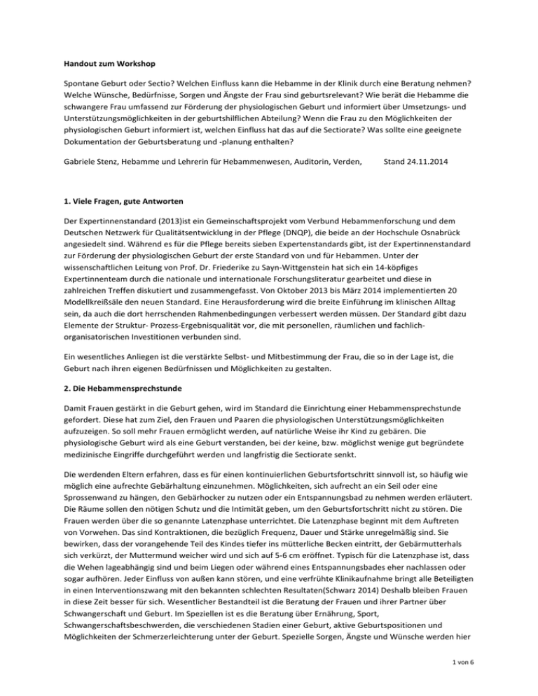 Handout zum Workshop Spontane Geburt oder Sectio? Welchen Einfluss kann die Hebamme in der Klinik durch eine Beratung nehmen? Welche Wünsche, Bedürfnisse, Sorgen und Ängste der Frau sind geburtsrelevant? Wie berät die Hebamme die schwangere Frau umfassend zur Förderung der physiologischen Geburt und informiert über Umsetzungs- und Unterstützungsmöglichkeiten in der geburtshilflichen Abteilung? Wenn die Frau zu den Möglichkeiten der physiologischen Geburt informiert ist, welchen Einfluss hat das auf die Sectiorate? Was sollte eine geeignete Dokumentation der Geburtsberatung und -planung enthalten? Gabriele Stenz, Hebamme und Lehrerin für Hebammenwesen, Auditorin, Verden, Stand 24.11.2014 1. Viele Fragen, gute Antworten Der Expertinnenstandard (2013)ist ein Gemeinschaftsprojekt vom Verbund Hebammenforschung und dem Deutschen Netzwerk für Qualitätsentwicklung in der Pflege (DNQP), die beide an der Hochschule Osnabrück angesiedelt sind. Während es für die Pflege bereits sieben Expertenstandards gibt, ist der Expertinnenstandard zur Förderung der physiologischen Geburt der erste Standard von und für Hebammen. Unter der wissenschaftlichen Leitung von Prof. Dr. Friederike zu Sayn-Wittgenstein hat sich ein 14-köpfiges Expertinnenteam durch die nationale und internationale Forschungsliteratur gearbeitet und diese in zahlreichen Treffen diskutiert und zusammengefasst. Von Oktober 2013 bis März 2014 implementierten 20 Modellkreißsäle den neuen Standard. Eine Herausforderung wird die breite Einführung im klinischen Alltag sein, da auch die dort herrschenden Rahmenbedingungen verbessert werden müssen. Der Standard gibt dazu Elemente der Struktur- Prozess-Ergebnisqualität vor, die mit personellen, räumlichen und fachlichorganisatorischen Investitionen verbunden sind. Ein wesentliches Anliegen ist die verstärkte Selbst- und Mitbestimmung der Frau, die so in der Lage ist, die Geburt nach ihren eigenen Bedürfnissen und Möglichkeiten zu gestalten. 2. Die Hebammensprechstunde Damit Frauen gestärkt in die Geburt gehen, wird im Standard die Einrichtung einer Hebammensprechstunde gefordert. Diese hat zum Ziel, den Frauen und Paaren die physiologischen Unterstützungsmöglichkeiten aufzuzeigen. So soll mehr Frauen ermöglicht werden, auf natürliche Weise ihr Kind zu gebären. Die physiologische Geburt wird als eine Geburt verstanden, bei der keine, bzw. möglichst wenige gut begründete medizinische Eingriffe durchgeführt werden und langfristig die Sectiorate senkt. Die werdenden Eltern erfahren, dass es für einen kontinuierlichen Geburtsfortschritt sinnvoll ist, so häufig wie möglich eine aufrechte Gebärhaltung einzunehmen. Möglichkeiten, sich aufrecht an ein Seil oder eine Sprossenwand zu hängen, den Gebärhocker zu nutzen oder ein Entspannungsbad zu nehmen werden erläutert. Die Räume sollen den nötigen Schutz und die Intimität geben, um den Geburtsfortschritt nicht zu stören. Die Frauen werden über die so genannte Latenzphase unterrichtet. Die Latenzphase beginnt mit dem Auftreten von Vorwehen. Das sind Kontraktionen, die bezüglich Frequenz, Dauer und Stärke unregelmäßig sind. Sie bewirken, dass der vorangehende Teil des Kindes tiefer ins mütterliche Becken eintritt, der Gebärmutterhals sich verkürzt, der Muttermund weicher wird und sich auf 5-6 cm eröffnet. Typisch für die Latenzphase ist, dass die Wehen lageabhängig sind und beim Liegen oder während eines Entspannungsbades eher nachlassen oder sogar aufhören. Jeder Einfluss von außen kann stören, und eine verfrühte Klinikaufnahme bringt alle Beteiligten in einen Interventionszwang mit den bekannten schlechten Resultaten(Schwarz 2014) Deshalb bleiben Frauen in diese Zeit besser für sich. Wesentlicher Bestandteil ist die Beratung der Frauen und ihrer Partner über Schwangerschaft und Geburt. Im Speziellen ist es die Beratung über Ernährung, Sport, Schwangerschaftsbeschwerden, die verschiedenen Stadien einer Geburt, aktive Geburtspositionen und Möglichkeiten der Schmerzerleichterung unter der Geburt. Spezielle Sorgen, Ängste und Wünsche werden hier 1 von 6 an das geburtshilfliche Team herangetragen. Die Hebamme verfügt über die erforderlichen Kompetenzen um die schwangere Frau zu den Möglichkeiten zur Förderung einer physiologischen Geburt beraten zu können. Die Hebammensprechstunde darf nicht mit der Anmeldung zur Geburt, dem Anlegen eines Geburtsjournals oder dem ärztlichen Geburtsplanungsgespräch verwechselt werden. 3. Wie wird der Erfolg der Hebammensprechstunde ausgewertet Zunächst einmal ist relevant, wie viele Frauen tatsächlich die Sprechstunde besuchen, der Anteil an Mehr-und Erstgebärenden, ebenso die durchschnittliche Zeitdauer der Gespräche. Ein Auswertungsbogen zur Zufriedenheit kann der Frau in der Pretestphase unmittelbar nach und noch einmal mit vierwöchigem Abstand zur Geburt überreicht werden. Die Fragen der Krankenhausleitung und des geburtshilflichen Teams zur Effizienz der Hebammensprechstunde unterscheiden sich wahrscheinlich von der subjektiven Zufriedenheit der Frauen und sollten im Team entwickelt und getrennt erhoben werden: • Welche Qualitätskriterien werden zur Auswertung herangezogen? • Reicht die Erfragung von Wünschen, Bedürfnissen, Sorgen und Ängsten der Frau um die Sectiorate zu verringern? • Was verändert sich, wenn die Hebamme die schwangere Frau umfassend zur Förderung der physiologischen Geburt, über Umsetzung -und Unterstützungsmöglichkeiten in der geburtshilflichen Abteilung berät? • Was sollte ein Beratungsleitfaden zur physiologischen Geburt enthalten? • Wie kann ein gemeinsames Vorgehen von Ärzten und Hebammen zu den Möglichkeiten der physiologischen Geburt aussehen? • Was wäre eine geeignete Dokumentation der Geburtsberatung? • Welcher Zeitraum ist für die Implementierung sinnvoll? Um dazu einen validen Fragebogen zu erstellen und auszuwerten ist professionelle Hilfe notwendig. Ein Zeitraum von 2 Jahren sollte ei