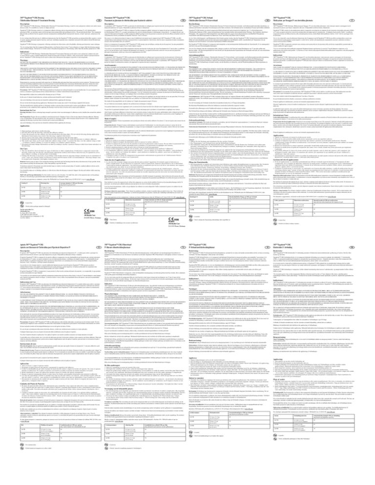 3M™ Tegaderm™ CHG Dressing Chlorhexidine Gluconate IV Securement Dressing GB Pansement 3M™ Tegaderm™ CHG Pansement au gluconate de chlorhexidine pour fixation de cathéters FR 3M™ Tegaderm™ CHG-Verband Chlorhexidin-Gluconat IV-Fixierverband DE 3M™ Tegaderm™ CHG Medicazione per fissaggio IV con clorexidina gluconata IT Description: Description : Beschreibung: Descrizione: 3M™ Tegaderm™ CHG Dressing, Chlorhexidine Gluconate IV Securement Dressing, is used to cover and protect catheter sites and to secure devices to skin. It is available in a variety of shapes and sizes. Le pansement 3M™ Tegaderm™ CHG au gluconate de chlorhexidine est indiqué pour la protection des sites de ponction et la fixation des dispositifs médicaux sur la peau. Disponible en plusieurs formes et dimensions. 3M™ Tegaderm™ CHG-Verband, Chlorhexidin-Gluconat IV-Fixierverband wird verwendet, um Katheterpunktionsstellen abzudecken, zu schützen und Katheter und andere Vorrichtungen an der Haut zu fixieren. Die Verbände sind in verschiedenen Formen und Größen erhältlich. 3M™ Tegaderm™ CHG Dressing, Medicazione per fissaggio IV con clorexidina gluconata, viene usata per coprire e proteggere siti di inserzione di cateteri e per fissare i dispositivi alla cute. È disponibile in diverse forme e dimensioni. Tegaderm™ CHG Dressing consists of a transparent adhesive dressing and an integrated gel pad containing 2% w/w chlorhexidine gluconate (CHG), an antiseptic agent with broad spectrum antimicrobial and antifungal activity. The gel pad absorbs fluid. The transparent film provides an effective barrier against external contamination including fluids (waterproof), bacteria, viruses* and yeast, and protects the IV site. Le pansement 3M™ Tegaderm™ CHG est composé d’un film transparent adhésif intégrant un tampon de gel qui contient du gluconate de chlorhexidine (CHG) à 2%, un agent antiseptique avec activité antimicrobienne et antifongique à large spectre. Le tampon de gel a une capacité d’absorption de liquides. Le film transparent adhésif protège le site de ponction en assurant une barrière efficace (étanche) contre la contamination externe, notamment de liquides, bactéries, virus* et levures. Tegaderm™ CHG besteht aus einem transparenten Klebeverband und einem integrierten Gelpolster mit 2 %-(Gewichtsprozent) Chlorhexidin-Glukonat (CHG), einem Antiseptikum mit breit antimikrobieller und antimykotischer Wirkung. Das Gelpolster absorbiert Flüssigkeit. Der transparente Filmverband bietet eine effektive Barriere gegen externe Kontamination einschließlich Flüssigkeiten (wasserdicht) und Mikroorganismen wie Bakterien, Viren* und Pilzen und schützt den IV-Zugang. Tegaderm™ CHG consiste in una medicazione adesiva trasparente con integrato un tampone di gel contenente clorexidina gluconata (CHG) al 2% p/p, un agente antisettico con attività antimicrobica ad ampio spettro e antimicotica. Il tampone di gel assorbe i fluidi. La pellicola trasparente fornisce un’efficace barriera alla contaminazione esterna, inclusi fluidi (idrorepellente), batteri, virus* e lieviti e protegge il sito di inserzione. In vitro testing (time kill and zone of inhibition) demonstrates that the Tegaderm™ CHG gel pad has an antimicrobial effect against a variety of gram- positive and gram-negative bacteria, and yeast, including organisms most commonly associated with catheter-related bloodstream infections (CRBSI). Des essais in vitro (destruction dans le temps et zone d’inhibition) ont montré que le tampon de gel 3M™ Tegaderm™ CHG a un effet antimicrobien contre plusieurs bactéries à gram positives et à gram négatives et des levures, dont les micro-organismes les plus couramment associés à des bactériémies liées aux cathéters. In-vitro-Tests (Abtötungszeit- und Hemmzonen-Tests) konnte gezeigt werden, dass der Tegaderm™ CHG-Verband einen antimikrobiellen Effekt auf unterschiedliche gram-positive und gram-negative Bakterien und Hefepilze ausübt, einschließlich auf Organismen, die am häufigsten mit durch Katheter verursachten Septikämien (CRBSI) einhergehen. Test in vitro (time kill e zona di inibizione) dimostrano che il tampone in gel di Tegaderm™ CHG ha un effetto antimicrobico contro una varietà di batteri gram-positivi e gram-negativi e contro lieviti ,inclusi gli organismi più comunemente associati a infezioni correlate a catetere intravascolare (CRBSI). Tegaderm™ CHG Dressing is transparent, allowing continual site observation, and is breathable, allowing good moisture vapor exchange. Grâce à sa transparence le pansement 3M™ Tegaderm™ CHG permet une surveillance continue du site de ponction. Sa semi-perméabilité favorise l’évacuation de la vapeur d’eau et laisse respirer la peau. Der Tegaderm™ CHG-Verband ist transparent und ermöglicht so eine kontinuierliche Sichtkontrolle der Einstichstelle. Er ist atmungsaktiv und bietet eine gute Wasserdampfdurchlässigkeit. Tegaderm™ CHG è trasparente, permette una continua osservazione del sito di inserzione ed ha un’elevata traspirabilità, permettendo un ottimo scambio di vapore acqueo. *Les essais in vitro montrent que le film transparent constitue une barrière virale pour des virus d’un diamètre de 27 nm ou plus, à condition qu’il n’y ait pas de fuites et que l’intégrité du pansement soit respectée. La capacité de barrière contre les virus est due aux propriétés physiques du pansement, plutôt qu’à une action supplémentaire du CHG. *In-vitro Tests belegen, dass der transparente Film, solange er intakt ist, für Viren mit einem Durchmesser von 27 nm oder größer eine Barriere bildet. Die Barriereeigenschaft für Viren beruht auf den physikalischen Eigenschaften des Verbandes und nicht auf den zusätzlichen Eigenschaften von CHG. *I test in vitro mostrano che la pellicola trasparente Tegaderm fornisce una barriera ai virus di 27 nm di diametro o superiore, se la medicazione r