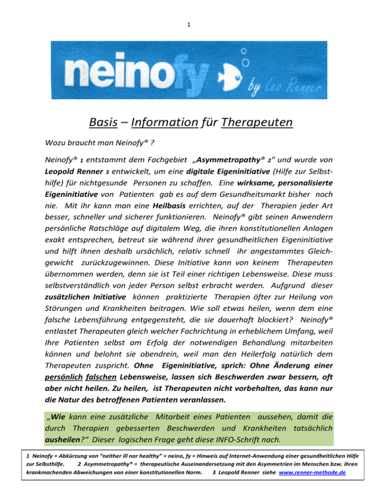 1 Basis – Information für Therapeuten Wozu braucht man Neinofy® ? Neinofy® 1 entstammt dem Fachgebiet „Asymmetropathy® 2“ und wurde von Leopold Renner 3 entwickelt, um eine digitale Eigeninitiative (Hilfe zur Selbsthilfe) für nichtgesunde Personen zu schaffen. Eine wirksame, personalisierte Eigeninitiative von Patienten gab es auf dem Gesundheitsmarkt bisher noch nie. Mit ihr kann man eine Heilbasis errichten, auf der Therapien jeder Art besser, schneller und sicherer funktionieren. Neinofy® gibt seinen Anwendern persönliche Ratschläge auf digitalem Weg, die ihren konstitutionellen Anlagen exakt entsprechen, betreut sie während ihrer gesundheitlichen Eigeninitiative und hilft ihnen deshalb ursächlich, relativ schnell ihr angestammtes Gleichgewicht zurückzugewinnen. Diese Initiative kann von keinem Therapeuten übernommen werden, denn sie ist Teil einer richtigen Lebensweise. Diese muss selbstverständlich von jeder Person selbst erbracht werden. Aufgrund dieser zusätzlichen Initiative können praktizierte Therapien öfter zur Heilung von Störungen und Krankheiten beitragen. Wie soll etwas heilen, wenn dem eine falsche Lebensführung entgegensteht, die sie dauerhaft blockiert? Neinofy® entlastet Therapeuten gleich welcher Fachrichtung in erheblichem Umfang, weil Ihre Patienten selbst am Erfolg der notwendigen Behandlung mitarbeiten können und belohnt sie obendrein, weil man den Heilerfolg natürlich dem Therapeuten zuspricht. Ohne Eigeninitiative, sprich: Ohne Änderung einer persönlich falschen Lebensweise, lassen sich Beschwerden zwar bessern, oft aber nicht heilen. Zu heilen, ist Therapeuten nicht vorbehalten, das kann nur die Natur des betroffenen Patienten veranlassen. „Wie kann eine zusätzliche Mitarbeit eines Patienten aussehen, damit die durch Therapien gebesserten Beschwerden und Krankheiten tatsächlich ausheilen?“ Dieser logischen Frage geht diese INFO-Schrift nach. 1 Neinofy = Abkürzung von “neither ill nor healthy” = neino, fy = Hinweis auf Internet-Anwendung einer gesundheitlichen Hilfe zur Selbsthilfe. 2 Asymmetropathy® = therapeutische Auseinandersetzung mit den Asymmetrien im Menschen bzw. ihren krankmachenden Abweichungen von einer konstitutionellen Norm. 3 Leopold Renner siehe www.renner-methode.de 2 Medico curat, Natura sanat! Neinofy® baut auf zwei natürlichen Wirkprinzipien auf: Dem richtigen, persönlichen Live-Timing 4: Wann tu ich was im Leben, um mich gesund und wohl zu fühlen? Der richtigen Wohlfühlstrategie 5: Was tu ich zur richtigen Zeit, um mich gesund und wohl zu fühlen? Nehmen Patienten Ihr scheinbares Schicksal zusätzlich selbst in die Hand, dann verstehen und lernen sie, um was es gesundheitlich geht und warum sie was in ihrem Leben ändern müssen. Neinofy® verhilft ihnen zu dieser Erkenntnis. Was fehlt grundsätzlich jedem Patienten? Es fehlt das Wissen, wie seine persönliche Wohlfühlstrategie auszusehen hat! Neinofy® besteht aus drei heilsamen Do it yourself-Welten 6 : SOFORT-Hilfe-Help Es gibt 5 verschiedene kostenlose Helps. Um den richtigen Help 7 zu finden, muss man zuvor den Schnelltest durchführen! Neino-Help Es gibt 28 verschiedene kosten lose Helps. Um den richtigen Help zu finden, muss man zuvor die Online-Diagnose „basic“ durchführen. Premium-Help es gibt 2 verschiedene kostenlose Helps. Um den richtigen Help zu finden, muss man zuvor die Online-Diagnose „premium“ durchführen! Schnelltest und Online-Diagnose sind kostenpflichtige Dienstleistungen. Durchführung auf Website www.neinofy.com Dienstleistungspreis für Schnelltest = € 6.90 = Voraussetzung einer Eigeninitiative bei leichten Fällen. Dienstleistungspreis für Online-Diagnose „basic“ = € 29.90 = Voraussetzung einer Eigeninitiative bei schwierigen, vertrackten Fällen. Dienstleistungspreis für Online-Diagnostik „premium“ = € 179.90 = Voraussetzung einer Eigeninitiative bei chronischen Fällen und manchen Krankheiten. 4 Live Timing = richtiger Zeitpunkt einer gesundheitlichen Handlung. 5 Wohlfühlstrategie = von Neinofy vorgeschlagener persön licher Maßnahmenkatalog. 6 Drei Do it yourself Welten = unterschiedliche Eigeninitiative bei unterschiedlicher Problemstellung. 7 Help = Katalog von Hilfsmaßnahmen für persönliche Eigeninitiative in Form chronologischer Schritte. Hilft ein Schritt, eine Störung oder Krankheit zu beenden (zu heilen), unterbleiben die nächsten. Die Selbsthilfe bleibt auf diesen Schritt konzentriert. 3 Vor die richtige Eigeninitiative haben die Götter die Diagnose gestellt. Um zu erfahren, was man wie und wann an sich ändern müsste, um gesünder zu reagieren, braucht man einen Einblick in den konstitutionellen SOLL-Zustand 8 und den momentanen IST-Zustand 9 eines Patienten, um die Differenz 10 zwischen beiden Vorgängen zu erkennen. Diese Aufgabe erfüllen die drei Online- Diagnose-Formen von Neinofy®: Schnelltest = gut für einfache Fälle, die nicht heilen oder enden wollen. Online-Diagnose „basic“ = gut für schwierige, vertrackte Fälle, die sich durch Therapien nicht bessern und die nicht heilen wollen. Online-Diagnose „premium“ = gut für alle chronischen Fälle, auch bei manchen Krankheiten, die sich nicht bessern und nicht heilen wollen. Die diagnostischen Dienstleistungen können nicht kostenlos angeboten werden, weil angestellte Sachbearbeiter bezahlt werden müssen, die sie durchführen. Sämtliche Helps, die die Anwender von Neinofy im Anschluss an die Diagnose erhalten plus ihre Betreuung und zusätzliche Beratungen sind kostenlos! Non Profit für Neinofy®, full Profit für Neinofy-Anwender! 1. Auf welcher Grundlage funktionieren Schnelltest und SOFORTHilfe-Helps? Eigeninitiative zur Heilung relativ einfacher Fälle: SCHNELLTEST SOFORT–HILFE Geringer Aufwand geringe Kosten gute Wirksamkeit Der Schnelltest gibt Auskunft über das biophysikalische Verhalten des Körpers. Wie gesund ist er in diesem Sinn? Zwei Möglichkeiten: Gute Gesundheit oder mangelhafte Gesundhe