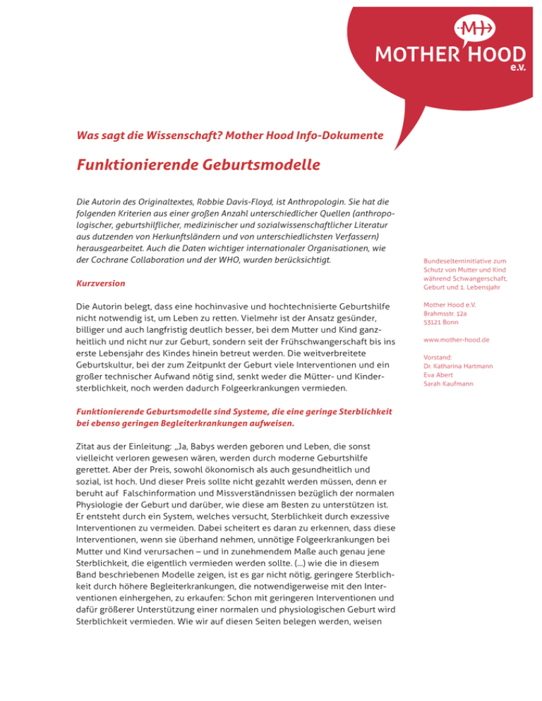 Was sagt die Wissenschaft? Mother Hood Info-Dokumente Funktionierende Geburtsmodelle Die Autorin des Originaltextes, Robbie Davis-Floyd, ist Anthropologin. Sie hat die folgenden Kriterien aus einer großen Anzahl unterschiedlicher Quellen (anthropologischer, geburtshilflicher, medizinischer und sozialwissenschaftlicher Literatur aus dutzenden von Herkunftsländern und von unterschiedlichsten Verfassern) herausgearbeitet. Auch die Daten wichtiger internationaler Organisationen, wie der Cochrane Collaboration und der WHO, wurden berücksichtigt. Kurzversion Die Autorin belegt, dass eine hochinvasive und hochtechnisierte Geburtshilfe nicht notwendig ist, um Leben zu retten. Vielmehr ist der Ansatz gesünder, billiger und auch langfristig deutlich besser, bei dem Mutter und Kind ganzheitlich und nicht nur zur Geburt, sondern seit der Frühschwangerschaft bis ins erste Lebensjahr des Kindes hinein betreut werden. Die weitverbreitete Geburtskultur, bei der zum Zeitpunkt der Geburt viele Interventionen und ein großer technischer Aufwand nötig sind, senkt weder die Mütter- und Kindersterblichkeit, noch werden dadurch Folgeerkrankungen vermieden. Funktionierende Geburtsmodelle sind Systeme, die eine geringe Sterblichkeit bei ebenso geringen Begleiterkrankungen aufweisen. Zitat aus der Einleitung: „Ja, Babys werden geboren und Leben, die sonst vielleicht verloren gewesen wären, werden durch moderne Geburtshilfe gerettet. Aber der Preis, sowohl ökonomisch als auch gesundheitlich und sozial, ist hoch. Und dieser Preis sollte nicht gezahlt werden müssen, denn er beruht auf Falschinformation und Missverständnissen bezüglich der normalen Physiologie der Geburt und darüber, wie diese am Besten zu unterstützen ist. Er entsteht durch ein System, welches versucht, Sterblichkeit durch exzessive Interventionen zu vermeiden. Dabei scheitert es daran zu erkennen, dass diese Interventionen, wenn sie überhand nehmen, unnötige Folgeerkrankungen bei Mutter und Kind verursachen – und in zunehmendem Maße auch genau jene Sterblichkeit, die eigentlich vermieden werden sollte. (...) wie die in diesem Band beschriebenen Modelle zeigen, ist es gar nicht nötig, geringere Sterblichkeit durch höhere Begleiterkrankungen, die notwendigerweise mit den Interventionen einhergehen, zu erkaufen: Schon mit geringeren Interventionen und dafür größerer Unterstützung einer normalen und physiologischen Geburt wird Sterblichkeit vermieden. Wie wir auf diesen Seiten belegen werden, weisen einige wenig-interventionistische Geburtshilfemodelle eine geringere Anzahl an Folgeerkrankungen und geringere (oder gleichwertige) Sterblichkeit auf, als hoch-interventionistische Geburtshilfemodelle.“ Eigenschaften von Geburtsmodellen, die nicht funktionieren • • • • • • • • • • Unnötiger, durch Interventionen hervorgerufener physischer, sozialer und emotionaler Schaden, der aus übermäßigem Gebrauch von Medikamenten und Technologien (wie Einleitung, Wehentropf, CTG, Dammschnitt und Kaiserschnitt) resultiert. Nichtbeachtung der wissenschaftlichen Belege, die den Routinemäßigen Einsatz von Interventionen nicht stützen. Nichtbeachtung der wissenschaftlichen Belege, dass humanistische, Frauen-zentrierte und physiologisch Geburtstechniken (wie Begleitung durch eine vertraute Person, aufrechte Gebärhaltungen) zu insgesamt weniger Verletzungen und allgemein besseren Ergebnissen führen. Gestörte Etablierung der Stillbeziehung (durch Einsatz von Medikamenten unter Geburt, Trennung von Mutter und Kind nach der Geburt). Von einer technokratischen und patriarchalischen Ideologie geprägt, die annimmt, dass Frauenkörper störanfällige Maschinen sind, und dass Geburt ein problematischer und risikoreicher Prozess ist. Durch diese Ideologie rechtfertigen die Geburtshelfer moralisch den übermäßigen Gebrauch von Technologien. Krankenhausregeln und -hierarchien behindern das kreative Denken und die Akzeptanz des wissenschaftlich-belegten und nichtintervenierenden Ansatzes. Fokus auf Status oder ökonomischem Gewinn für Institutionen und Personen anstatt Fokus auf Wohlergehen von Mutter und Kind. Ausbildungsmodelle, die Geburtshelfer (Ärzte und Hebammen) zu einer technokratischen Sichtweise auf Geburt sozialisieren und die Geburtshelfer zu einer Gemeinschaft machen, aus der die Frau in ihrer Obhut ausgeschlossen ist. Informationen, die zu wirklich informierter Einschätzung der Vor- und Nachteile der geburtshilflichen Maßnahmen nicht ausreichen und somit eine fundierte Entscheidung behindern. Versteckter oder offener Druck auf die Frauen, die standardisierten Interventionen des technokratischen Ansatzes zu akzeptieren. Ineffektive Verlegungssysteme für außerklinische Geburten in die Klinik und respektlose oder unmenschliche Behandlung bei Eintreffen im Krankenhaus. Eigenschaften von Geburtsmodellen, die funktionieren • • • • • • • • • • • • • • • • • • • • • Orientiert sich an der Frauen-zentrierten Ideologie (international bekannt als „midwifery model of care“). Hebammenbetreuung für normale Schwangerschaften und Geburten Wohnortnahe Versorgung. Kontinuierliche Betreuung (1:1 oder Hebammenpraxis) flankiert von kreativer Nutzung angemessener Technologien, um eine normale Geburt zu unterstützen . Bestrebungen, nicht nur Sterblichkeit sondern auch Folgeerkrankungen durch optimale Betreuung zu vermeiden. Sensibilität für die Kultur, die die betreute Frau mitbringt . Ärzte und Spezialisten stehen bereit, um Frauen mit hohem Risiko und bei geburtshilflichen Notfällen zu helfen . Gegenseitiger Respekt und funktionierende Zusammenarbeit zwischen allen Gesundheitsdienstleistern . Rücküberweisung (bedeutet, dass eine Frau, deren Zustand sich normalisiert und die wieder ein geringes Risiko trägt, in die „normale“ Hebammenbetreuung zurückgegeben werden kann. Reflektierter Umgang der Gesundheitsdienstleister mit dem eigenen Handeln, Fehlerreflexion, etc. um Ve