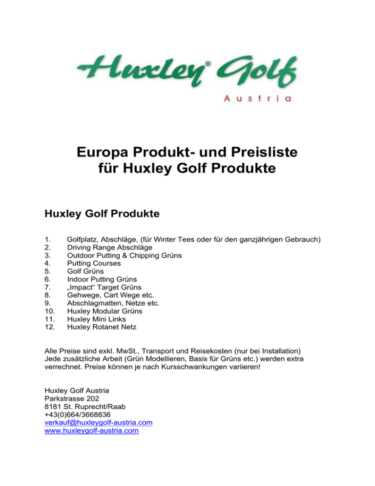 Europa Produkt- und Preisliste für Huxley Golf Produkte Huxley Golf Produkte 1. 2. 3. 4. 5. 6. 7. 8. 9. 10. 11. 12. Golfplatz, Abschläge, (für Winter Tees oder für den ganzjährigen Gebrauch) Driving Range Abschläge Outdoor Putting & Chipping Grüns Putting Courses Golf Grüns Indoor Putting Grüns „Impact“ Target Grüns Gehwege, Cart Wege etc. Abschlagmatten, Netze etc. Huxley Modular Grüns Huxley Mini Links Huxley Rotanet Netz Alle Preise sind exkl. MwSt., Transport und Reisekosten (nur bei Installation) Jede zusätzliche Arbeit (Grün Modellieren, Basis für Grüns etc.) werden extra verrechnet. Preise können je nach Kursschwankungen variieren! Huxley Golf Austria Parkstrasse 202 8181 St. Ruprecht/Raab +43(0)664/3668836 [email protected] www.huxleygolf-austria.com Produkte 1a 2a 2b 3 Huxley Golf Course Tees mit Premier Tee Turf2 (kein Füller für die Matte notwendig) installiert auf einer vorinstallierten Grundbasis Huxley Practice Tees mit Premier Tee Turf2 (kein Füller für die Matte notwendig) installiert auf einer vorinstallierten Grundbasis Huxley Practice Tees mit Nylon Tee Turf (kein Füller für die Matte notwendig) installiert auf einer vorinstallierten Grundbasis Huxley Outdoor Putting und Chipping Grün Mit Premier Nylon Grün Turf with Turfill®2 Füller installiert auf Huxcell Base Anwendung für: Ideal für Familien für zuhause oder Tour Pros, Amateur Golfer, Golfclubs, Driving Ranges, Trainings Akademies, Hotels Leistung: Turnierstandard Putting und Chipping auf grünen Rasen das ganze Jahr. Verbessert das Putten und Chippen 4 Kommentar: Wird verwendet von Major Championship Gewinner und European Tour Professionals, PGA´s etc. Huxley Putting Kurs (6, 9 oder 18 Loch) Gleiches Material wie für Putting und Chipping Grün Preisliste für Huxley Produkte exklusive Versand und MwSt. 3.66 m x 3.66 m € 2520,-3.66 m x 7.32 m € 5040,-3.66 m x 10.98 m € 7560,-3.66 m x 3.66 m 3.66 m x 7.32 m 3.66 m x 10.98 m 3.66 m x 14.64 m 3.66 m x 18.30 m 3.66 m x 21.96 m 3.66 m x 25.62 m 1.83 m x 10.98 m 1.83 m x 22.86 m 3.66 m x 10.98 m 3.66 m x 22.86 m 4.57 m x 1.82 m 4.57 m x 2.73 m 4.57 m x 3.66 m 4.57 m x 4.57 m 4.57 m x 6.10 m 4.57 m x 7.62 m 4.57 m x 9.14 m 6.10 m x 9.14 m 9.14 m x 9.14 m 9.14 m x 13.72 m 9.14 m x 18.29 m 13.72 m x 13.72 m 13.72 m x 18.29 m € 2520,-€ 5040,-€ 7560,-€ 10080,-€ 12600,-€ 15120,-€ 16170,-€ 4080,-€ 8100,-€ 7560,-€ 15420,-€ 2088,-€ 2718,-€ 3210,-€ 3972,-€ 5010,-€ 6024,-€ 6720,-€ 9066,-€ 12960,-€ 18618,-€ 23592,-€ 26490,-€ 34500,-- Angebot nach Besichtigung mit Kunden. Individuelle Anwendung für: Resorts, Hotels, Golf Ranges, Bars etc. Sehen sie auch Huxley Minilinks (11) 5 Huxley „Golf Grüns“ Premier Nylon (Stoßfest) Golf Grün mit Turfill®3 Filler und installiert auf Huxcell Basis Anwendung für: All-Weather Golf grün für „Pay and Play“ Kurse, Hotels, Schulen, Academies Kommentare: Größe von 4.57 m x 6.1 m 4.57 m x 6.10 m € 5424,-4.57 m x 9.14 m € 7230,-6.10 m x 9.14 m € 9702,-9.14 m x 9.14 m € 14040,-9.14 m x 13.72 m € 20220,-9.14 m x 18.29 m € 25500,-13.72 m x 13.72 m € 28470,-13.72 m x 18.29 m € 37050,-- 6a Huxley Indoor Putting Grün Premier Nylon (Stoßfest) Golf Grün mit Turfill®3 Filler und installiert auf Huxcell Basis (Rahmen für Matte ohne Ondulierung) 4.57 m x 2.44 m € 3180,-4.57 m x 4.57 m € 4554,-- Anwendung für: Indoor Übungs- und Unterrichtsfläche Benefits: True Ball Roll und Geschwindigkeit wie auf normalen Grüns 6b Kommentare: Größe von 4.57 m x 2.44 m Huxley Indoor Putting Grün Premier Nylon (Stoßfest) Golf Grün mit Turfill®3 Filler und installiert auf Huxcell Basis (Rahmen für Matte mit Ondulierungen) Anwendung für: Indoor Übungs- und Unterrichtsfläche 4.57 m x 4.57 m € 4620,-4.57 m x 9.14 m € 8256,-9.14 m x 9.14 m € 13728,-- Benefits: True Ball Roll und Geschwindigkeit wie auf normalen Grüns. Kommentare: Größe von 4.57 m x 4.57 m 7 Hulxe „Impact“ Ziel Grüns Premier „Impact-Dämpfung“ Ziel Grün mit Turfill®4 Filler installiert auf einer preparierten Grundbasis Anwendung für: Ideal für ein Short Game Areal für Driving Range, Golfclubs, Akademies, Amateur Golfer 7.31 m x 7.60 m 10.97 m x 7.60 m 14.63 m x 7.60 m 14.63 m x 11.27 m 22.80 m x 14.63 m € 4980,-€ 7440,-€ 9810,-€ 14190,-€ 26940,-- Benefits: Sieht wie natürliches Gras aus 8 Kommentare: Größe von 7.31 m x 7.6 m Huxley Wege, Cartwege Premier ¾ (19mm) Weg Turf mit Turfill® 1 Filler, installiert auf einer preparierten Grundbasis Anwendung für: Ideal für Wege ums Clubhaus, Hotelanlagen, Golfplatz, Brücken am Golfplatz Angebot nach Besichtigung mit Kunden. Preis variiert aufgrund der Grundbasis, Größe. Benefits: Attraktiv, Sicher, sieht aus wie natürliches Gras 9a Kommentare: Standard Rolle sind 3.66 m x 22.86 m Huxley Practice Matte Premier Nylon Tee Turf (1.46 m x 1.46 m) mit 2 Gummi Tees Preis: € 354,-- 9b Huxley Übungs Netze Einzelnetz: 3 m x 3.5m x 3 m Doppelnetz: 3 m x 3.5 m x 6 m Dreifachnetz: 3 m x 3.5 m x 9 m 10 Huxley Modular Grüns Portables Putting Grün mit einem starken Panel-Steck-System Anwendungen für: Golf für Zuhause, Pro-Shops, Schulen, Turniere, Ranges, Golfclubs etc. Preis für: € 1440,-€ 2160,-€ 3360,-(exklusive Verpackung und Versandkosten) Sehen sie die separate Preisliste für Huxley Modular Grüns www.modern-golfshop.com Benefits: Schnell und einfach montiert Portabel und einfach aufbewahrt Kann Online gekauft werden unter www.modern-golfshop.com 11 Huxley Mini Links Hoch qualitatives Mini Golf System Portabel und einfach installiert in nur wenigen Minuten Anwendungen für: Hotels, Resorts, Parks, Shows, Schauräume und Shops Sehen sie die separate Preisliste für Huxley Minilinks oder kontaktieren Sie [email protected] Benefits: Kann überall installiert werden. 12 Kommentare: Wählen Sie 1 Loch oder 1-3 Löcher, 9 oder 18 Löcher Huxley Rotanet Golf Übungs- Netz für Zuhause oder Golfclu
