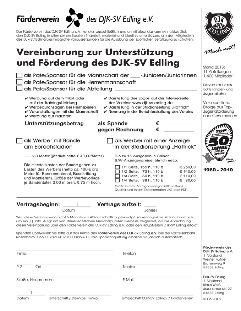 Förderverein des DJK-SV Edling e.V. Der Förderverein des DJK-SV Edling e.V. verfolgt ausschließlich und unmittelbar das gemeinnützige Ziel, den DJK-SV Edling in allen seinen Sparten finanziell, materiell und ideell zu unterstützen, um den Mitgliedern des DJK-SV Edling bestmögliche Voraussetzungen für die Ausübung der sportlichen Betätigung zu schaffen. Vereinbarung zur Unterstützung und Förderung des DJK-SV Edling als Pate/Sponsor für die Mannschaft der -Junioren/Juniorinnen als Pate/Sponsor für die Herrenmannschaft als Pate/Sponsor für die Abteilung Werbung auf dem Trikot oder auf der Trainingskleidung Werbedurchsagen bei Heimspielen Veranstaltungen mit der Mannschaft Werbung auf Plakaten Unterstützungsbetrag Darstellung des Logos auf der Internetseite des Vereins: www.djk-sv-edling.de Darstellung in der Stadionzeitung „Hattrick“ Nennung in der Berichterstattung des Vereins als Spende gegen Rechnung als Werber mit einer Anzeige in der Stadionzeitung „Hattrick“ als Werber mit Bande am Ebrachstadion x 3 Meter (jährlich netto € 40,00/Meter). Die Herstellkosten der Bande gehen zu Lasten des Werbers (netto ca. 100 € pro Meter für Bandenmaterial, Beschriftung und Montieren). Größe der Werbevorlage je Bandentafel: 3,00 m breit, 0,75 m hoch. Vertragsbeginn: Datum € € Davon mehr als 50% Kinder- und Jugendliche Viele sportliche Erfolge aus TopJugendförderung über Generationen erung Jugendförd rationen über Gene H-SRVE JADJK EDLING Bis zu 15 Ausgaben je Saison. S/W-Anzeigenpreise jährlich netto: 1/1 Seite, 155 h, 110 b 1/2 Seite, 75 h, 110 b 1/3 Seite, 50 h, 110 b 1/4 Seite, 38 h, 110 b Stand 2013: 11 Abteilungen 1.400 Mitglieder Bärig guat ! € 250,00 € 140,00 € 110,00 € 80,00 1960 - 2010 Größe in mm. Anzeigenvorlagen bitte in DruckQualität und in den Dateiformaten JPG oder PDF. Vertragslaufzeit: Jahr(e) Wird diese Vereinbarung nicht 6 Monate vor Ablauf schriftlich gekündigt, so verlängert sie sich automatisch um ein (1) Jahr. Aufgrund von steuerrechtlichen Gesichtspunkten bleibt es freigestellt, ob die Abrechnung dieser Vereinbarung über den Förderverein des DJK-SV Edling e.V. oder den Hauptverein DJK-SV Edling erfolgt. Spenden überweisen Sie bitte auf das Konto des Förderverein des DJK-SV Edling e.V. bei der Raiffeisenbank Rosenheim: IBAN DE2871601610003226611. Ihre Spendenquittung erhalten Sie jährlich automatisch. Firma PLZ Telefon Ort Telefax Straße, Hausnummer E-Mail Datum Unterschrift DJK-SV Edling / Förderverein Unterschrift / Stempel Firma Förderverein des DJK-SV Edling e.V. 1. Vorstand: Werner Furtner Eschenweg 9 83533 Edling DJK-SV Edling 1. Vorstand: Klaus Weiß Stauhamer Str. 27 83533 Edling © 06.2013