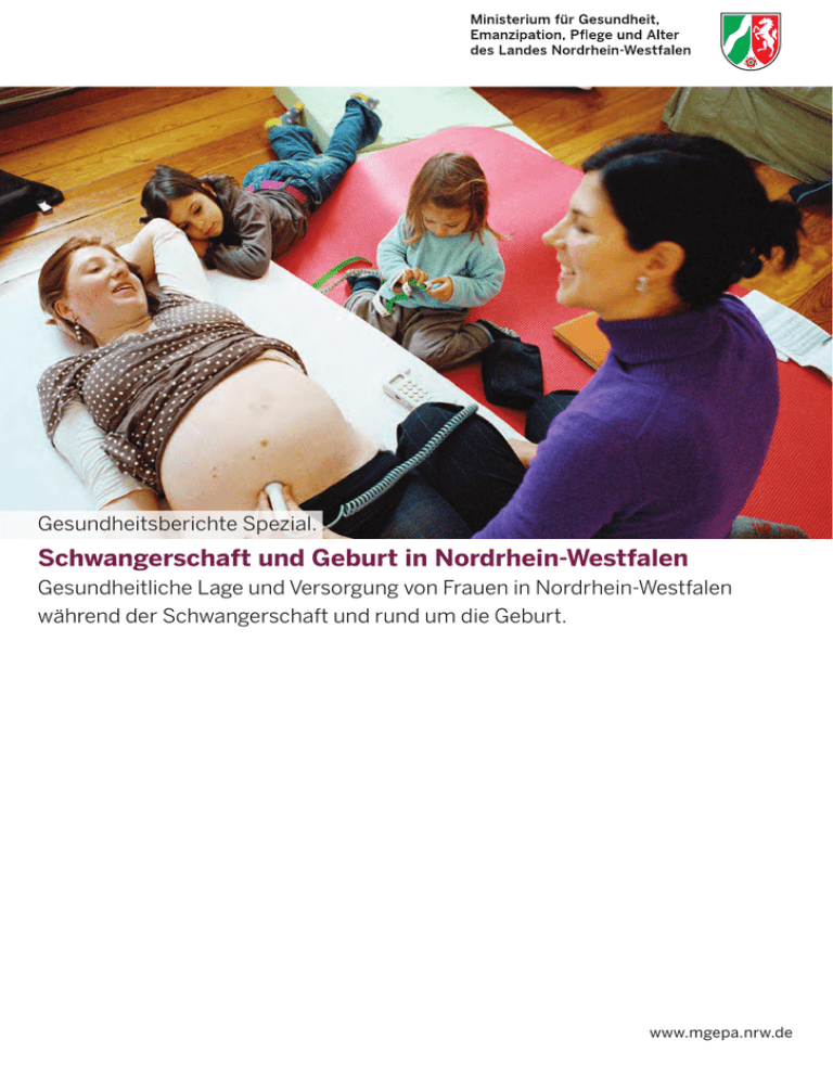 Gesundheitsberichte Spezial. Schwangerschaft und Geburt in Nordrhein-Westfalen Gesundheitliche Lage und Versorgung von Frauen in Nordrhein-Westfalen während der Schwangerschaft und rund um die Geburt. www.mgepa.nrw.de Gesundheitsberichte Spezial. Schwangerschaft und Geburt in Nordrhein-Westfalen Gesundheitliche Lage und Versorgung von Frauen in Nordrhein-Westfalen während der Schwangerschaft und rund um die Geburt. Vorwort der Ministerin Barbara Steffens Vorwort Es ist ein Verdienst der geburtshilflichen Betreuung, dass die Säuglingssterblichkeit in den letzten Jahrzehnten deutlich gesunken ist. Dazu beigetragen haben die Fortschritte der Medizintechnik, doch dürfen wir darüber nicht vergessen, dass Geburten ein natürlicher Vorgang sind und nicht jede Schwangerschaft eine Risikoschwangerschaft. Die Erfahrung hat gezeigt, dass eine Schwangerenbetreuung, die sich in erster Linie auf mögliche Risiken konzentriert und alle medizintechnischen Möglichkeiten ausschöpft, eher verunsichert und Ängste verstärkt. Neben einer guten medizinischen Versorgung brauchen Frauen während der Schwangerschaft und auch noch in der Zeit nach der Geburt ganzheitliche Beratungs- und Betreuungsangebote, auch und gerade als psychologische Unterstützung. Dafür muss die Beratungsarbeit auch die soziale Lebenssituation der Frauen berücksichtigen. Hinzu kommt: Frauen wollen wählen, in welchem Rahmen sie ihr Kind zur Welt bringen. Ob im Geburtshaus, zu Hause oder doch auf einer besonderen Geburtsstation im Krankenhaus – dem Wunsch nach Wahlfreiheit müssen wir durch Angebotsvielfalt Rechnung tragen. Der vorliegende „Gesundheitsbericht Spezial“ widmet sich vor allem drei Gruppen, die von den Beratungs- und Betreuungsangeboten oft nicht gut erreicht werden: Frauen mit Gewalterfahrung in der Schwangerschaft, schwangere Teenager sowie Frauen mit Migrationsgeschichte. Während manche Frauen schon von einem Zuviel an Untersuchungen während der Schwangerschaft sprechen, werden wichtige Vorsorgeuntersuchungen und Beratungstermine von Frauen mit Migrationsgeschichte, schwangeren Mädchen oder Frauen in schwierigen sozialen Lagen nicht oder nur sehr selten in Anspruch genommen. Es ist darum notwendig, Angebote noch passgenauer und zielgruppengerechter auszugestalten. Dabei müssen das Gesundheitssystem und andere begleitende Institutionen wie Sozial- und Jugendämter, Schulen und Einrichtungen der Familienhilfe enger zusammenarbeiten. Eine besondere interdisziplinäre Aufgabe kommt den Familienhebammen zu. Mit dem vorliegenden „Gesundheitsbericht Spezial“ wurden erstmals statistische Daten zu den unterschiedlichen Ausgangslagen und Risikofaktoren zusammengetragen. Daraus wurden Vorschläge entwickelt, wie wir den Anforderungen an die zukünftige geburtshilfliche Versorgung gerecht werden können. Barbara Steffens Ministerin für Gesundheit, Emanzipation, Pflege und Alter des Landes Nordrhein-Westfalen ( 5 MGEPA Gesundheitsbericht Spezial Datum 10. 11. 12. 13. 14. SSW gen . H G b ew ic nd Va g Un ina te le rs uc h sl ht ag e o nein o nein o nein o ja Zeitgerechte Entwicklung SSL o ja o o Kontrolle nein Konsiliarunter suchung veranlasst o nein BPD o ja . o ja Sonstige T FS ch t Kontrolbedür o ja o nein o Kont rolle Hb o nein o nein o Kontrolle Ge wi o ja o ja o normal III. Screening 29 - 32 SSW Einling o ja Kindslage o nein o ja Lebenszeichen o nein o ja Plazentalok o o normal o nein Kontrolle Zeitgerechte Entwicklung o ja o nein o Kont Va g Un inal te e rs uc h ss ta ge sla Zeitgerechte Entwicklung Untersuchun 19 - 22 SSW Einling Lebenszeichen Plazentalok nd du II. Screening Ki 7 8. 9. 6 SSE ss ta SSW Gravidogram5m nd 3 Datum 9 - 12 SSW Intrauteriner Sitz o ja Embryo darste llbar o ja Herzaktion o ja V.a. Mehrlinge o nein Auffälligkeit o nein 2. 4 I. Screening Ki 1. du Da t SSE Fu n SSW um Datum Ultraschall- nd Gravidogramm Bemerkungen Fu n ) um 6 Da t ftige Befund e hinsichtl. Fruchtwasser o nein o ja körperl. Entw menge o nein o ja Körperumrissicklung o nein o ja fetale Struktur en o nein o ja Herztätigkeit o nein o ja Bewegungen o nein o ja Konsilarunter s. o nein o ja Sonstige Therap BPD FOD ATD APD Kontrolbedür rolle ftige Befund e hinsichtl. Fruchtwasser o nein o ja körperl. Entw menge o nein o ja Körperumrissicklung o nein o ja fetale Struktur en o nein o ja Herztätigkeit o nein o ja Bewegungen o nein o ja Konsilarunter s. o nein o ja BPD FOD ATD APD FL Inhaltsangabe Inhaltsangabe Einleitung 1. ..................................................................................................... 11 KAPITEL Geburtenrate und Säuglingssterblichkeit .............. 17 1.1. Geburtenrate ....................................................................................... 17 1.2. Säuglingssterblichkeit . ...................................................................... 17 2. KAPITEL Schwangerschaft ................................................................ 21 2.1. Schwangerenvorsorge ........................................................................ 21 2.1.1. Gesetzliche Grundlagen und Struktur ................................................ 21 2.1.2. Inanspruchnahme der Vorsorge ........................................................ 22 2.1.3. Nutzen und Erreichbarkeit ................................................................. 23 Therapie 2.2. Schwangerschaftsberatung ............................................................. 25 2.3. Schwangerschaftsabbrüche ............................................................. 25 2.4. Schwangerschaftsrisiken . ................................................................ 26 2.5. Gesundheitsriskantes Verhalten in der Schwangerschaft ........... 27 2.5.1. Alkohol-, Tabak- und Drogenkonsum ................................................ 27 2.5.2. Übergewicht und Adipositas ............................................................. 27 3. KAPITEL Geburt ................................................................