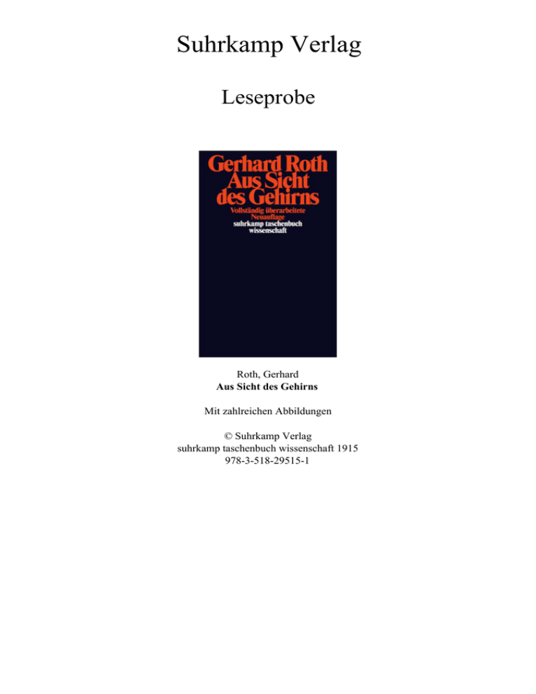 Suhrkamp Verlag Leseprobe Roth, Gerhard Aus Sicht des Gehirns Mit zahlreichen Abbildungen © Suhrkamp Verlag suhrkamp taschenbuch wissenschaft 1915 978-3-518-29515-1 suhrkamp taschenbuch wissenschaft 1915 Gerhard Roth verfolgt das Projekt, mithilfe der Erkenntnisse der modernen Neurobiologie und Hirnforschung Fragen zu beantworten, die von jeher Philosophen, Wissenschaftler und alle denkenden Menschen beschäftigt haben: Sind wir Menschen einzigartig? Wie entsteht unsere Bewusstseinswelt? Können wir die Welt erkennen, wie sie ist, oder nehmen wir nur Konstruktionen unseres Gehirns wahr? Auf was sollen wir hören: auf den Verstand oder die Gefühle? Wer oder was formt uns: Gene, das Unbewusste oder die Erziehung? Ist mein Wille frei? Diese und ähnliche Fragen werden in zwölf Kapiteln auf eine Weise behandelt, die keinerlei fachwissenschaftliche Vorkenntnisse erfordert. Das Buch präsentiert die Umrisse eines neuen Menschenbildes, das naturwissenschaftlich begründet ist und zugleich Einsichten der Geistes- und Sozialwissenschaften berücksichtigt. Gerhard Roth ist Professor für Verhaltensphysiologie an der Universität Bremen. Im Suhrkamp Verlag sind von ihm erschienen: Das Gehirn und seine Wirklichkeit (stw 1275), Fühlen, Denken, Handeln (stw 1678), Freiheit, Schuld und Verantwortung (mit Michael Pauen, eu 12) und Willensfreiheit und rechtliche Ordnung (hg. mit Ernst-Joachim Lampe und Michael Pauen, stw 1833) Gerhard Roth Aus Sicht des Gehirns Vollständig überarbeitete Neuauflage Suhrkamp Bibliografische Information der Deutschen Nationalbibliothek Die Deutsche Nationalbibliothek verzeichnet diese Publikation in der Deutschen Nationalbibliografie; detaillierte bibliografische Daten sind im Internet über http://dnb.d-nb.de abrufbar. suhrkamp taschenbuch wissenschaft 1915 © Suhrkamp Verlag Frankfurt am Main 2003, 2009 Alle Rechte vorbehalten, insbesondere das der Übersetzung, des öffentlichen Vortrags sowie der Übertragung durch Rundfunk und Fernsehen, auch einzelner Teile. Kein Teil des Werkes darf in irgendeiner Form (durch Fotografie, Mikrofilm oder andere Verfahren) ohne schriftliche Genehmigung des Verlages reproduziert oder unter Verwendung elektronischer Systeme verarbeitet, vervielfältigt oder verbreitet werden. Druck: Druckhaus Nomos, Sinzheim Printed in Germany Umschlag nach Entwürfen von Willy Fleckhaus und Rolf Staudt ISBN 978-3-518-29515-1 1 2 3 4 5 6 – 14 13 12 11 10 09 Inhalt Vorwort zur überarbeiteten Auflage . . . . . . . . . . . . . . . . . . . . 7 Vorwort . . . . . . . . . . . . . . . . . . . . . . . . . . . . . . . . . . . . . . . . . . 11 1. Eine kleine Hirnkunde . . . . . . . . . . . . . . . . . . . . . . . . . . . 2. Welt, Körper, Ich . . . . . . . . . . . . . . . . . . . . . . . . . . . . . . . 3. Was uns Menschen so klug macht . . . . . . . . . . . . . . . . . . 4. Wahrnehmung: Abbildung oder Konstruktion? . . . . . . . . 5. Die Spur der Erinnerungen . . . . . . . . . . . . . . . . . . . . . . . 6. Wer oder was bestimmt uns? . . . . . . . . . . . . . . . . . . . . . . 7. Geist und Gehirn . . . . . . . . . . . . . . . . . . . . . . . . . . . . . . . . 8. Ich und Es – die Welt der Persönlichkeit und des Psychischen . . . . . . . . . . . . . . . . . . . . . . . . . . . . . . 9. Verstand oder Gefühle – auf was sollen wir hören? . . . 10. Freiheit, die ich meine . . . . . . . . . . . . . . . . . . . . . . . . . . . . 11. Über die letzten Dinge . . . . . . . . . . . . . . . . . . . . . . . . . . . 12. Wissenschaft und Wahrheit . . . . . . . . . . . . . . . . . . . . . . . . 13 33 51 69 90 109 127 147 167 180 205 217 Weiterführende Literatur . . . . . . . . . . . . . . . . . . . . . . . . . . . . 233 Namenregister . . . . . . . . . . . . . . . . . . . . . . . . . . . . . . . . . . . . . 238 Sachregister . . . . . . . . . . . . . . . . . . . . . . . . . . . . . . . . . . . . 239 Vorwort zur überarbeiteten Auflage Die vorliegende Ausgabe ist eine vollständig überarbeitete Version des 2003 erstmalig erschienenen Buches Aus Sicht des Gehirns. Dessen Erscheinen fiel zeitlich zusammen mit dem Beginn der in der wissenschaftlichen wie medialen Öffentlichkeit heftig geführten Diskussion um die Willensfreiheit. Dabei waren das Kapitel 10 der bisherigen Fassung sowie die ausführlichere Darstellung in der überarbeiteten Auflage meines Buches Fühlen, Denken, Handeln, die zeitgleich ebenfalls im Suhrkamp Verlag erschien, vielzitierter Anlass zu Zustimmung und Kritik. Ich hatte geglaubt, in beiden Texten eine sowohl wissenschaftlich als auch philosophisch ausgewogene Position zu vertreten. Das wurde aber von einer Reihe von philosophischen Kritikern nicht so gesehen; vielmehr unterstellten sie, dass ich – neben anderen Neurobiologen – Willensfreiheit komplett als »Illusion« ablehne und sogar die Existenz eines Willens in Zweifel ziehe. Tatsächlich aber wandte ich mich nur gegen die traditionelle dualistisch-indeterministische Auffassung von Willensfreiheit, die allerdings nicht nur unserem alltäglichen Empfinden der Handlungssteuerung, sondern auch dem deutschen und kontinentaleuropäischen Strafrecht und seinem Schuldbegriff zugrunde liegt. Es dauerte einige Jahre, bis sich von philosophischer Seite eine differenziertere Wahrnehmung des Standpunkts der beteiligten Hirnforscher herausbildete. Gleichzeitig veränderte sich auch – zumindest bei mir – die Einschätzung der Aussagekraft der vielzitierten Experimente Benjamin Libets und seiner Nachfolger. Und schließlich ergab sich für mich in der engen Zusammenarbeit mit dem Philosophen Michael Pauen eine Neukonzeption des Begriffs »Willensfreiheit«, die den Gegensatz zwischen Willensfreiheit und Determiniertheit philosophisch und wissenschaftlich auflöst. Michael Pauen und ich haben unsere gemeinsame Auffassung in dem Buch Freiheit, Schuld und Verantwortung – Grundzüge einer naturalistischen Theorie der Willensfreiheit dargelegt, das im Herbst 2008 ebenfalls im Suhrkamp Verlag erschien