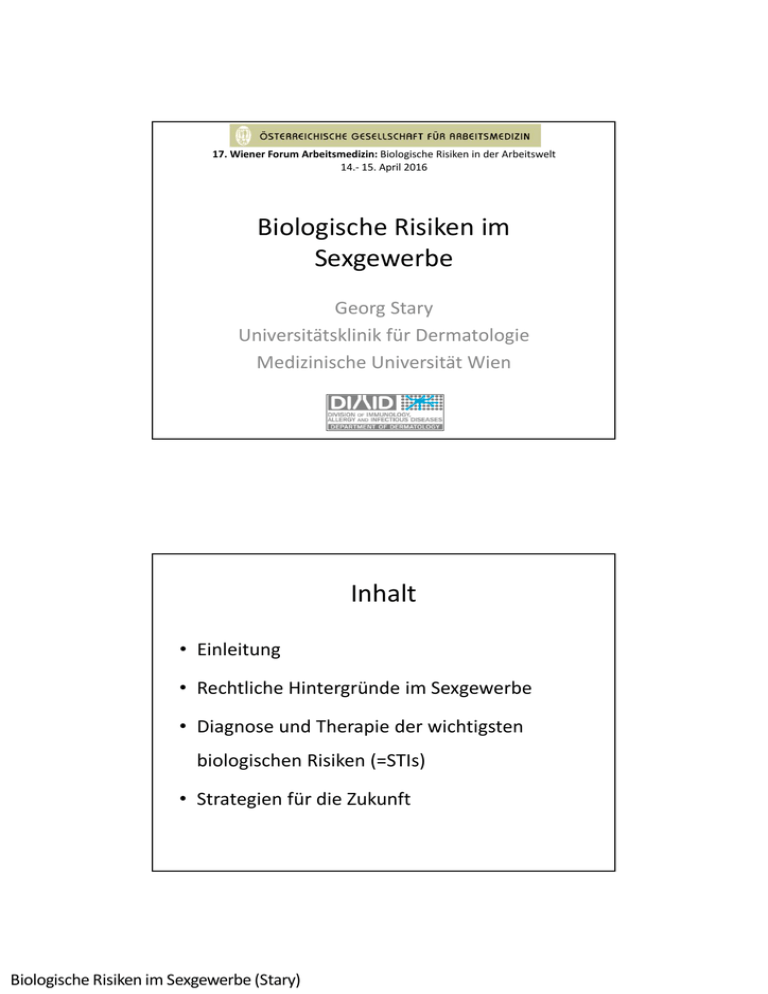 17. Wiener Forum Arbeitsmedizin: Biologische Risiken in der Arbeitswelt 14.- 15. April 2016 Biologische Risiken im Sexgewerbe Georg Stary Universitätsklinik für Dermatologie Medizinische Universität Wien Inhalt • Einleitung • Rechtliche Hintergründe im Sexgewerbe • Diagnose und Therapie der wichtigsten biologischen Risiken (=STIs) • Strategien für die Zukunft Biologische Risiken im Sexgewerbe (Stary) Sexgewerbe - Prostitution • Vornahme sexueller Handlungen gegen Entgelt („Schandlohn”, „Dirnenlohn”) • prostituere „nach vorn/zur Schau stellen, preisgeben“ • Schon im Altertum üblich Prostitution in Österreich • Etwa 6.000 – 7.000 registrierte Prostituierte österreichweit • Wien: ca. 3.400 weibliche, <100 männliche Prostituierte • Lange Zeit als “sittenwidriger Vertrag” angesehen und daher ohne rechtliche Möglichkeiten (bis 2012!) • In Österreich nicht strafbar Biologische Risiken im Sexgewerbe (Stary) Was ist eine sexuell übertragbare Erkrankung? • Synonyme: – Sexually transmitted Diseases (=STD) – Sexually transmitted Infections (=STI) • Ansteckung über sexuellen oder intimen körperlichen Kontakt • Primärmanifestation meist anogenital • Keine schützende Immunität (mit Ausnahme der Hepatitis B) • Geschlechtskrankheiten: speziell vom Gesetz als solche definiert 5 Inhalt • Einleitung • Rechtliche Hintergründe der gesundheitlichen Untersuchung im Sexgewerbe • Diagnose und Therapie der wichtigsten biologischen Risiken (=STIs) • Strategien für die Zukunft Biologische Risiken im Sexgewerbe (Stary) Situation in Wien • MA 15 – Gesundheitsdienst der Stadt Wien, Ambulatorium zur Diagnose und Behandlung von Geschlechtskrankheiten • Zusammenlegung mit dermatologischer Abteilung in der Rudolfstiftung (vor 1 Jahr) • Hauptaufgaben: – – – – Aufklärung – primäre & sekundäre Prävention Früherkennung von Geschlechtskrankheiten und STIs Diagnose und Therapie von Geschlechtskrankheiten Sanitätspolizeiliche Überwachung der SexarbeiterInnen Diagnostischer Fokus • Geschlechtskrankheiten – – – – Syphilis Gonorrhoe Ulcus molle Lymphogranuloma venereum • Sexuell-übertragbare Erkrankungen (STIs) – HIV – Chlamydia trachomatis • Sonstige – Bakterielle – Virale – Parasitäre Infektionen Biologische Risiken im Sexgewerbe (Stary) Rechtsvorschrift für Gesundheitliche Überwachung von Prostituierten (bis 2016) • § 1. Personen, die gewerbsmäßig sexuelle Handlungen am eigenen Körper dulden oder solche Handlungen an anderen vornehmen, haben sich vor Beginn dieser Tätigkeit sowie regelmäßig im Abstand von einer Woche einer amtsärztlichen Untersuchung auf das Freisein von Geschlechtskrankheiten zu unterziehen. • Wöchentlich: klinische Untersuchung, MethylenblauFärbung • Alle 6 Wochen: – Gonokokken und Chlamydia trachomatis PCR – HIV, Syphilis Serologie alle 6 Wochen Verpflichtende Untersuchungen für SexarbeiterInnen in Europa 2015 Lettland Österreich Griechenland Biologische Risiken im Sexgewerbe (Stary) Rechtsvorschrift für Gesundheitliche Überwachung von Prostituierten (seit 2016) • § 1. (1) Personen, die gewerbsmäßig sexuelle Handlungen am eigenen Körper dulden oder solche Handlungen an anderen vornehmen, haben sich vor Beginn dieser Tätigkeit (Eingangsuntersuchung) sowie in regelmäßigen Abständen von sechs Wochen einer amtsärztlichen Untersuchung (Kontrolluntersuchung) auf das Freisein von Geschlechtskrankheiten zu unterziehen. Im Rahmen der Eingangsuntersuchung ist insbesondere auf das Freisein von Tripper und Syphilis zu untersuchen, die Kontrolluntersuchung auf das Freisein von Tripper ist im Abstand von sechs Wochen und auf das Freisein von Syphilis im Abstand von zwölf Wochen zu wiederholen. Gemeldete Zahlen an Syphilis in Österreich 700 585 Cases of syphilis 600 500 400 431 428 420 401 538 450 316 300 553 494 553 540 352 312 237 267 200 184 100 124 Biologische Risiken im Sexgewerbe (Stary) 20 13 20 11 20 09 20 07 20 05 20 03 20 01 19 99 19 97 19 95 19 93 19 91 19 89 19 87 19 85 0 Gemeldete Zahlen an Gonorrhoe 1990 - 2014 Cases of gonorrhoea 1800 1750 1582 Austria 1661 Vienna 1497 1500 1341 1200 900 1160 1157 1085 1133 896 1032 846 836 600 300 661 985 595 539 440 434 414 379 448 902 1184 1015 848 846 777 737 736 658 573 633 615 511 1148 1151 945 960 825 707 542 451 413 291 311 293 179 19 90 19 91 19 92 19 93 19 94 19 95 19 96 19 97 19 98 19 99 20 00 20 01 20 02 20 03 20 04 20 05 20 06 20 07 20 08 20 09 20 10 20 11 20 12 20 13 20 14 0 1138 Gesundheitsbericht der Stadt Wien (1997): Registrierte Prostituierte gehörten zur „gesündesten“ Personengruppe Scheitz et al, submitted 2016 Biologische Risiken im Sexgewerbe (Stary) © Universitätsklinik für Dermatologie, Wien generalisiertes makulopapulöses Exanthem 23 palmare Plaques 24 © Universitätsklinik für Dermatologie, Wien Biologische Risiken im Sexgewerbe (Stary) © Universitätsklinik für Dermatologie, Wien plantare Papeln 25 Syphilisdiagnostik - Syphilisserologie 1) Treponemen-spezifische Tests Titerstufen korrelieren nicht mit Krankheitsaktivität („Seronarbe“) – – – – – TPPA (Treponema pallidum Partikelagglutinationstest) FTA-Abs (Fluoreszenz Treponema Antikörper Absorptionstest) 19S-IgM-FTA-ABS IgM-SPHA (IgM Solid-Phase-Häm-Adsorptionstest) IgM und IgG ELISA 2) Nicht-treponemale Tests Titerstufen zur Beurteilung der Krankheitsaktivität und des Therapieanspreches geeignet – – VDRL (Venereal Disease Research Laboratory Test) RPR (Rapid Plasma Reagin Test) 26 Biologische Risiken im Sexgewerbe (Stary) Nicht-treponemale Tests: “Biologisch falsch reaktiv” ” • Schwangerschaft • Antiphospholipid-Syndrom • Autoimmunerkrankungen • i.v. Drogenabusus • Viruserkrankungen (z.B. Mononukleose) 27 Therapie der Syphilis • Frühsyphilis (Infektionszeitpunkt < 1 Jahr) – Benzathin-Penicillin G 2,4 Mio IE i.m. als Einzeldosis – Alternativtherapie bei Penicillinallergie: 
