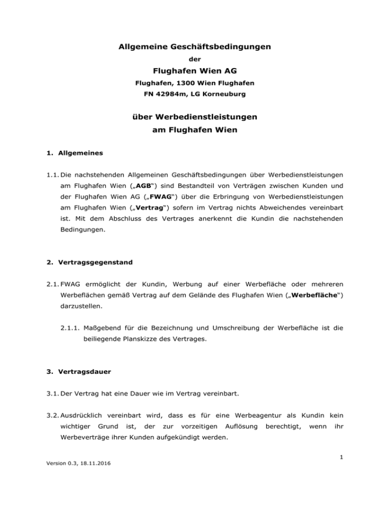 Allgemeine Geschäftsbedingungen der Flughafen Wien AG Flughafen, 1300 Wien Flughafen FN 42984m, LG Korneuburg über Werbedienstleistungen am Flughafen Wien 1. Allgemeines 1.1. Die nachstehenden Allgemeinen Geschäftsbedingungen über Werbedienstleistungen am Flughafen Wien („AGB“) sind Bestandteil von Verträgen zwischen Kunden und der Flughafen Wien AG („FWAG“) über die Erbringung von Werbedienstleistungen am Flughafen Wien („Vertrag“) sofern im Vertrag nichts Abweichendes vereinbart ist. Mit dem Abschluss des Vertrages anerkennt die Kundin die nachstehenden Bedingungen. 2. Vertragsgegenstand 2.1. FWAG ermöglicht der Kundin, Werbung auf einer Werbefläche oder mehreren Werbeflächen gemäß Vertrag auf dem Gelände des Flughafen Wien („Werbefläche“) darzustellen. 2.1.1. Maßgebend für die Bezeichnung und Umschreibung der Werbefläche ist die beiliegende Planskizze des Vertrages. 3. Vertragsdauer 3.1. Der Vertrag hat eine Dauer wie im Vertrag vereinbart. 3.2. Ausdrücklich vereinbart wird, dass es für eine Werbeagentur als Kundin kein wichtiger Grund ist, der zur vorzeitigen Auflösung berechtigt, wenn ihr Werbeverträge ihrer Kunden aufgekündigt werden. 1 Version 0.3, 18.11.2016 3.3. Die Kundin verzichtet im ersten Vertragsjahr auf ihr ordentliches Kündigungsrecht. 4. Entgelt 4.1. Die Kundin leistet an FWAG ein Entgelt wie im Vertrag vereinbart. 4.2. Im Entgelt enthalten sind die Leistungen wie im Vertrag vereinbart. 4.3. Das Entgelt ist spätestens acht Tage nach Rechnungsdatum im Voraus zur Zahlung fällig. Allfällige weitere Jahresentgelte sind jeweils bis zum 15. Jänner des jeweiligen Verlängerungsjahres bzw. binnen 14 Tagen nach eingetretener Vertragsverlängerung im Vorhinein zur Zahlung fällig. 4.4. Im Falle des Zahlungsverzuges verpflichtet sich die Kundin, Verzugszinsen im gesetzlichen Ausmaß (§ 456 UGB), mindestens jedoch 12 % zu entrichten. Darüber hinaus verpflichtet Schadenersatzansprüche sich iSd die § 1333 Kundin Abs 2 unbeschadet ABGB zum weitergehender Ersatz aller FWAG entstehenden Betreibungskosten. 4.5. Es wird ausdrücklich Wertbeständigkeit dieses Entgeltes vereinbart. Als Maß zur Berechnung der Wertbeständigkeit dient der von der Statistik Austria monatlich verlautbarte Verbraucherpreisindex 2016 = 100 oder, sofern dieser nicht mehr verlautbart wird, der an seine Stelle tretende Index. Indexstand September 2016. Das Entgelt wird per 01.01. eines jeden Jahres um jenen Prozentsatz erhöht, der sich aus der Veränderung der für den Monat September des letzten Jahres veröffentlichten Indexzahl zu jener für den Monat September des vorletzten Jahres verlautbarten Indexzahl ergibt, mindestens jedoch 3%. Das wie oben angeführt ermittelte neue Entgelt bildet sodann die Grundlage für die Berechnung der nächsten Anpassung. Sollte FWAG das Entgelt ohne Berücksichtigung der Wertsicherung entgegennehmen, so wird damit jedoch keinesfalls konkludent auf die Erhöhungsbeträge verzichtet. Es steht FWAG frei, diese Erhöhungsbeträge rückwirkend einzuheben. 2 Version 0.3, 18.11.2016 5. Rechte und Pflichten von FWAG 5.1. FWAG verpflichtet sich die Leistungen gemäß Vertrag zu erbringen. 5.2. FWAG ist berechtigt, Werbungen, die dem architektonischen Rahmen des Flughafen Wien nicht entsprechen, gegen strafgesetzliche Vorschriften verstoßen, anstößigen oder sonst den guten Sitten widersprechenden Inhalt haben, oder politische und (oder) religiöse Tendenzen verfolgen, jederzeit zu untersagen. Die Kundin wird darüber schriftlich informiert. FWAG ist berechtigt, in solchen Fällen die beanstandeten Werbesujets innerhalb von 24 Stunden zu entfernen bzw. von durch FWAG beauftragte Unternehmen entfernen zu lassen. Die Kosten der Entfernung werden der Kundin in Rechnung gestellt. 6. Rechte und Pflichten der Kundin 6.1. Jede Weitergabe von Rechten und Pflichten aus dem Vertragsverhältnis durch die Kundin an Dritte, sei es entgeltlich oder unentgeltlich, bedarf einer gesonderten schriftlichen Genehmigung durch FWAG. 6.2. Alle mit dem Vertrag allfälllig verbundenen Abgaben und Gebühren trägt die Kundin. 7. Herstellung und Montage von Standardwerbeflächen (nicht digital) 7.1. Die Herstellung von Standardwerbeflächen wird von FWAG durchgeführt. 7.2. Sämtliche Montage-, Austausch- und Demontagearbeiten von Spanntüchern werden ausschließlich durch FWAG oder durch ein von FWAG beauftragtes Unternehmen durchgeführt. 7.3. Liefert die Kundin das Werbesujet nicht so rechtzeitig, dass dieses zu dem unter Punkt 2 vereinbarten Vertragsbeginn angebracht werden kann, so erwächst der Kundin aus einer späteren Anbringung kein Anspruch auf Entgeltreduktion beziehungsweise aliquote Verlängerung des Vertrages. Die Kundin hat bis zum Zeitpunkt der tatsächlichen Anbringung ihrer eigenen Werbesujets keinen Anspruch auf Demontage allfällig vorhandener Werbesujets. 3 Version 0.3, 18.11.2016 7.4. Die Produktion und Montage der Spanntücher erfolgt erst nach schriftlicher Freigabe des Werbesujets durch FWAG an die Kundin. Dies gilt auch bei Änderung des Werbesujets. Die Kundin ist verpflichtet, die Werbung bzw. das Werbesujet umgehend zu erneuern bzw auszutauschen, sollte das Erscheinungsbild zB aufgrund von Verblassen oder Beschädigung jeglicher Art einem neuwertigen Spanntuch nicht mehr entsprechen. 7.5. Der Kundin entsteht kein Anspruch auf Entgeltreduktion bzw. aliquote Verlängerung des Vertrages, sofern aufgrund von Instandhaltungsarbeiten im Bereich der angebrachten Werbefläche die Werbewirksamkeit für einen Zeitraum von nicht mehr als 2 Wochen eingeschränkt ist. 8. Digitale Werbung 8.1. Die Kundin ist verpflichtet, die digitale Werbung gemäß den technischen Voraussetzungen an FWAG zu liefern, wie in den Beilagen zu diesen AGB definiert: 8.1.1. Mega Wall: Beilage 1, 8.1.2. Gepäckausgabebänder: Beilage 2, 8.1.3. Hochformatscreens: Beilage 3, 8.1.4. Querformatscreens: Beilage 4. 8.2. Sofern dies erforderlich ist, ist FWAG berechtigt, diese te