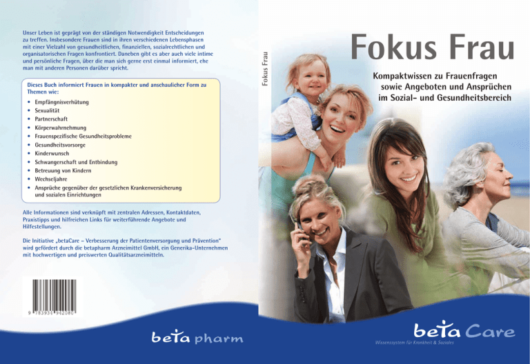 Dieses Buch informiert Frauen in kompakter und anschaulicher Form zu Themen wie: • • • • • • • • • • • Empfängnisverhütung Sexualität Partnerschaft Körperwahrnehmung Frauenspezifische Gesundheitsprobleme Gesundheitsvorsorge Kinderwunsch Schwangerschaft und Entbindung Betreuung von Kindern Wechseljahre Ansprüche gegenüber der gesetzlichen Krankenversicherung und sozialen Einrichtungen Alle Informationen sind verknüpft mit zentralen Adressen, Kontaktdaten, Praxistipps und hilfreichen Links für weiterführende Angebote und Hilfestellungen. Die Initiative „betaCare – Verbesserung der Patientenversorgung und Prävention“ wird gefördert durch die betapharm Arzneimittel GmbH, ein Generika-Unternehmen mit hochwertigen und preiswerten Qualitätsarzneimitteln. Fokus Frau Unser Leben ist geprägt von der ständigen Notwendigkeit Entscheidungen zu treffen. Insbesondere Frauen sind in ihren verschiedenen Lebensphasen mit einer Vielzahl von gesundheitlichen, finanziellen, sozialrechtlichen und organisatorischen Fragen konfrontiert. Daneben gibt es aber auch viele intime und persönliche Fragen, über die man sich gerne erst einmal informiert, ehe man mit anderen Personen darüber spricht. Fokus Frau Kompaktwissen zu Frauenfragen sowie Angeboten und Ansprüchen im Sozial- und Gesundheitsbereich Gesundheit ist unser Ziel! betaCare-Wissenssystem Unter www.betaCare.de stehen Ihnen weitere Informationen zur Verfügung: • Soziallexikon Die größte Suchmaschine für Sozialfragen im Gesundheitswesen in Deutschland. 4.800 Stichwörter helfen gezielt, soziale, rechtliche und finanzielle Fragen bei Behinderung, Krankheit, Pflege und Vorsorge einfach und verständlich zu beantworten. • Patientenratgeber zu verschiedenen Themen: Behinderung, Demenz, Elterngeld, Herzinfarkt, Neurodermitis, Parkinson, Patientenvorsorge, Pflege, Schmerz und vieles mehr. • Wer hilft? Selbsthilfegruppen und Beratungsstellen 22.000 Adressen, die mit Rat und Auskunft zur Verfügung stehen. • Patientenfilme zu Themen wie Asthma, Brustkrebs, Darmkrebs, Demenz, Depression, Diabetes, Osteoporose, Rheuma, Schlaganfall. • Krankenhaus Übersicht zum Leistungsangebot und der Qualität von Krankenhäusern. • Pflegeheime Pflegeheimsuche sowie Checkliste zur Pflegeheimauswahl. Abgedeckt sind Fragen z. B. aus den Bereichen „Wohnen und Ausstattung“, „Pflege und Betreeung“ sowie „Leistungen und Kosten“. • Reha-Kliniken Adressen mit Indikationssuche Inhaltsverzeichnis Schwangerschaftsverhütung _____________________________________ 5 Hormonelle Verhütungsmittel ______________________________________6 Mechanische Verhütungsmittel _____________________________________7 Chemische Verhütungsmittel _______________________________________7 Pille danach ____________________________________________________12 Leistungen der Krankenkasse ______________________________________13 Männer und Verhütung __________________________________________14 Sterilisation ____________________________________________________15 Wechseljahre und Verhütung ______________________________________16 Verhütung und Krebs ____________________________________________16 Frau und Körper ________________________________________17 Regelschmerzen ________________________________________________18 Scheidenflora verbessern _________________________________________19 Brustvergrößerung und -verkleinerung ______________________________20 Brustwiederherstellung nach Brustkrebs _____________________________22 Intimchirurgie und -piercings _____________________________________24 Haarausfall ____________________________________________________26 Essstörungen ___________________________________________________29 Krebsvorsorge __________________________________________33 Selbstuntersuchung der Brust _____________________________________34 Leistungen der Krankenkasse ______________________________________35 Private Leistungen bei Ärztinnen (IGeL) _____________________________36 Kinderwunsch __________________________________________39 Alter _________________________________________________________40 Risikofaktoren __________________________________________________40 Endometriose __________________________________________________43 Genetische Beratung_____________________________________________44 Künstliche Befruchtung __________________________________________45 Adoption ______________________________________________________47 Pflegekind aufnehmen ___________________________________________49 Homosexualität und Kinderwunsch _________________________________51 1 Feststellen einer Schwangerschaft _________________________53 Anzeichen _____________________________________________________54 Urintest _______________________________________________________54 Bluttest _______________________________________________________55 Ultraschalluntersuchung _________________________________________55 Schwangerschaft _______________________________________57 Schwangerschaftsberatung _______________________________________58 Leistungen der Krankenkasse ______________________________________59 Spezielle Vorsorgeprogramme der Krankenkassen _____________________61 Leistungen des Sozialamts ________________________________________61 Zusätzliche Leistungen bei Ärztinnen (IGeL) __________________________63 Mutterschutz ___________________________________________________66 Mutterschaftsgeld_______________________________________________69 Mittel der Bundesstiftung „Mutter und Kind“ ________________________72 Fehlgeburt und Totgeburt ________________________________________73 Schwangerschaft in einer Notlage _________________________75 Jugendamt ____________________________________________________76 Vorübergehende Pflege ___________________________________________77 Adoption ______________________________________________________78 Babyklappen ___________________________________________________79 Schwangerschaftsabbruch____________________________