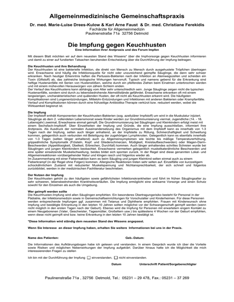 Allgemeinmedizinische Gemeinschaftspraxis Dr. med. Marie-Luise Drees-Kulow & Karl Arne Faust & Dr. med. Christiane Ferekidis Fachärzte für Allgemeinmedizin Paulinenstraße 71a 32756 Detmold Die Impfung gegen Keuchhusten Eine Information Ihrer Arztpraxis und des Forum Impfen Mit diesem Blatt möchten wir auf dem neuesten Stand des Wissens* über die Impfvorsorge gegen Keuchhusten informieren und damit zu einer auf fundierten Tatsachen beruhenden Entscheidung über die Durchführung der Impfung beitragen. Die Keuchhusten und ihre Behandlung Der Keuchhusten ist eine bakterielle Infektion, die direkt von Mensch zu Mensch durch ausgehustete Tröpfchen übertragen wird. Erwachsene sind häufig die Infektionsquelle für nicht oder unzureichend geimpfte Säuglinge, die dann sehr schwer erkranken. Nach heutiger Erkenntnis haften die Pertussis-Bakterien nach der Infektion an Atemwegszellen und scheiden ein Toxin (Giftstoff) ab, das zahlreiche biologische Wirkungen hervorruft. Typisch und namens gebend für die Erkrankung sind heftige Hustenanfälle mit Serien von Hustenstößen, welche durch ein pfeifendes Ziehen beim Einatmen unterbrochen werden und mit einem mühevollen Herauswürgen von zähem Schleim enden. Der Verlauf des Keuchhustens kann abhängig vom Alter sehr unterschiedlich sein. Junge Säuglinge zeigen nicht die typischen Hustenanfälle, sondern sind durch zu lebensbedrohende Atemstillstände gefährdet. Erwachsene erkranken oft mit einem langwierigen, uncharakteristischen und quälenden Husten, der oft nicht als Keuchhusten erkannt wird. Die häufigsten Komplikationen sind Lungenentzündungen, Mittelohr-Entzündungen und Infektionen mit anderen Bakterien oder Krampfanfälle. Verlauf und Komplikationen können durch eine frühzeitige Antibiotika-Therapie verkürzt bzw. reduziert werden, wobei die Wirksamkeit begrenzt ist. Die Impfung Der Impfstoff enthält Komponenten der Keuchhusten-Bakterien (sog. azellulärer Impfstoff) um wird in die Muskulatur injiziert. Säuglinge ab dem 2. vollendeten Lebensmonat sowie Kinder werden zur Grundimmunisierung viermal, Jugendliche (14. - 18. Lebensjahr) zweimal, Erwachsene einmal geimpft. Die Grundimmunisierung bei Säuglingen und Kleinkindern erfolgt meist mit einem Sechsfach-Impfstoff. Über Einzelheiten der Impfung und Gründe, die eine Impfung ausschließen, informiert Ihre Arztpraxis. Als Ausdruck der normalen Auseinandersetzung des Organismus mit dem Impfstoff kann es innerhalb von 1-3 Tagen nach der Impfung, selten auch länger anhaltend, an der Impfstelle zu Rötung, Schmerzhaftigkeit und Schwellung kommen, gelegentlich auch verbunden mit Beteiligung der zugehörigen Lymphknoten. Gelegentlich kann es ebenfalls innerhalb von 1-3 Tagen (selten länger anhaltend) auch zu Allgemeinsymptomen wie leichte bis mäßige Temperaturerhöhung, grippeähnliche Symptomatik (Frösteln, Kopf: und Gliederschmerzen, Müdigkeit, Kreislaufbeschwerden) oder Magen-DarmBeschwerden (Appetitlosigkeit, Übelkeit, Erbrechen, Durchfall) kommen. Auch länger anhaltendes schrilles Schreien wurde bei Säuglingen und jungen Kleinkindern beobachtet. Erwachsene vermerken gelegentlich muskelkaterähnliche Beschwerden und eine später einsetzende Muskelschwellung, beides bildet sich spontan zurück. In der Regel sind diese genannten Lokal- und Allgemeinreaktionen vorübergehender Natur und klingen rasch und folgenlos wieder ab. Im Zusammenhang mit einer Fieberreaktion kann es beim Säugling und jungen Kleinkind selten einmal auch zu einem Fieberkrampf (in der Regel ohne Folgen) kommen. Allergische Reaktionen treten sehr selten auf. Einzelfälle von kurzzeitigem schockähnlichem Zustand mit reduzierter Muskelspannung und Nichtansprechbarkeit, der sich schnell und folgenlos zurückbildet, werden in der medizinischen Fachliteratur beschrieben. Der Nutzen der Impfung Der Keuchhusten gehört zu den häufigsten sowie gefährlichsten Infektionskrankheiten und führt im frühen Säuglingsalter zu sehr schweren, lebensbedrohenden Krankheitsverläufen. Die Impfung ermöglicht eine wirksame Vorsorge und einen Schutz sowohl für den Einzelnen als auch die Umgebung. Wer geimpft werden sollte Die Keuchhusten-Impfung wird allen Säuglingen empfohlen. Ein besonderes Übertragungsrisiko besteht für Personal in der Pädiatrie, der Infektionsmedizin sowie in Gemeinschaftseinrichtungen für Vorschulalter und Kinderheimen. Für diese Personen werden entsprechende Impfungen ggf. zusammen mit Tetanus und Diphtherie empfohlen. Frauen mit Kinderwunsch ohne Impfung und bestätigte Erkrankung in den letzten 10 Jahren sollten möglichst vor der Schwangerschaft geimpft werden (wenn nicht möglich in den ersten Tagen nach der Geburt). Ebenso wird die Impfung für Personen mit erwartetem engem Kontakt zu einem Neugeborenen (Vater, Geschwister, Tagesmütter, Großeltern usw.) bis spätestens 4 Wochen vor der Geburt empfohlen, wenn diese nicht geimpft sind bzw. keine Erkrankung in den letzten 10 Jahren bestätigt ist. *Diese Information wird ständig dem neuesten Stand des Wissens angepasst. Wenn Sie Interesse an dieser Impfung haben, erhalten Sie weitere Informationen bei uns in der Praxis. Name des Patienten: Geb.-Datum: Die Informationen des Aufklärungsbogen habe ich gelesen und verstanden. In einem Gespräch wurde ich über die Vorteile sowie Risiken und möglichen Nebenwirkungen der Impfung aufgeklärt. Darüber hinaus hatte ich die Möglichkeit die mich interessierenden Fragen zu stellen Ich bin mit der Durchführung der Impfung einverstanden, nicht einverstanden. Datum Unterschrift Patient/Sorgeberechtigter Paulinenstraße 71a , 32756 Detmold, Tel.: 05231 – 29 478, Fax.: 05231 – 37 269