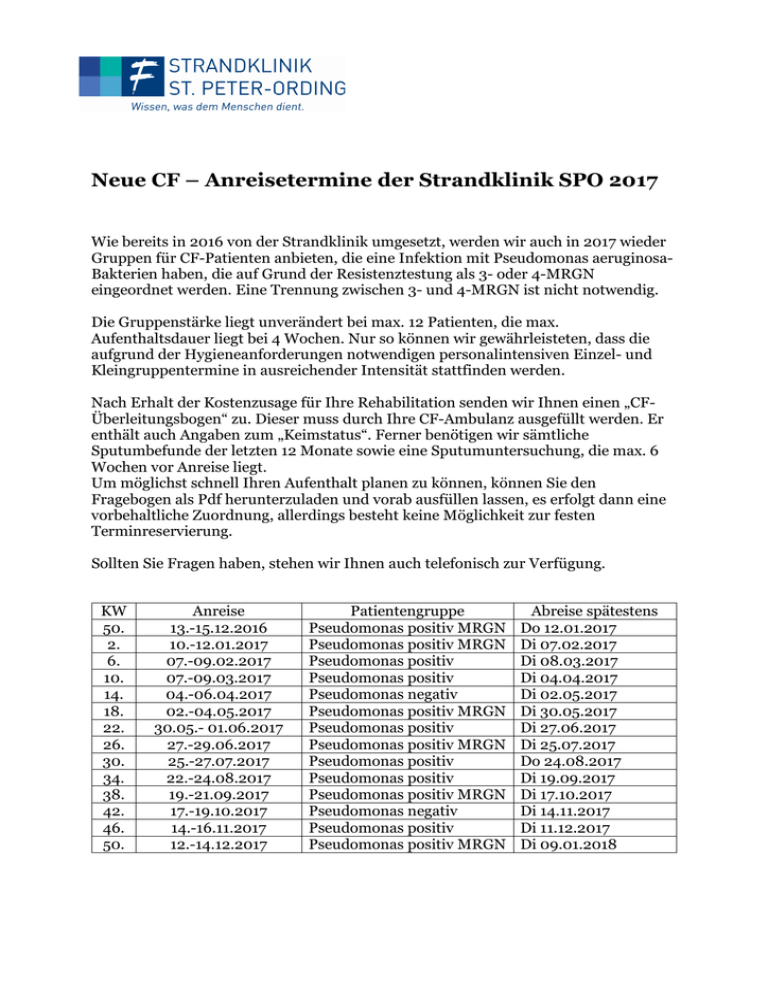 Neue CF – Anreisetermine der Strandklinik SPO 2017 Wie bereits in 2016 von der Strandklinik umgesetzt, werden wir auch in 2017 wieder Gruppen für CF-Patienten anbieten, die eine Infektion mit Pseudomonas aeruginosaBakterien haben, die auf Grund der Resistenztestung als 3- oder 4-MRGN eingeordnet werden. Eine Trennung zwischen 3- und 4-MRGN ist nicht notwendig. Die Gruppenstärke liegt unverändert bei max. 12 Patienten, die max. Aufenthaltsdauer liegt bei 4 Wochen. Nur so können wir gewährleisteten, dass die aufgrund der Hygieneanforderungen notwendigen personalintensiven Einzel- und Kleingruppentermine in ausreichender Intensität stattfinden werden. Nach Erhalt der Kostenzusage für Ihre Rehabilitation senden wir Ihnen einen „CFÜberleitungsbogen“ zu. Dieser muss durch Ihre CF-Ambulanz ausgefüllt werden. Er enthält auch Angaben zum „Keimstatus“. Ferner benötigen wir sämtliche Sputumbefunde der letzten 12 Monate sowie eine Sputumuntersuchung, die max. 6 Wochen vor Anreise liegt. Um möglichst schnell Ihren Aufenthalt planen zu können, können Sie den Fragebogen als Pdf herunterzuladen und vorab ausfüllen lassen, es erfolgt dann eine vorbehaltliche Zuordnung, allerdings besteht keine Möglichkeit zur festen Terminreservierung. Sollten Sie Fragen haben, stehen wir Ihnen auch telefonisch zur Verfügung. KW 50. 2. 6. 10. 14. 18. 22. 26. 30. 34. 38. 42. 46. 50. Anreise 13.-15.12.2016 10.-12.01.2017 07.-09.02.2017 07.-09.03.2017 04.-06.04.2017 02.-04.05.2017 30.05.- 01.06.2017 27.-29.06.2017 25.-27.07.2017 22.-24.08.2017 19.-21.09.2017 17.-19.10.2017 14.-16.11.2017 12.-14.12.2017 Patientengruppe Pseudomonas positiv MRGN Pseudomonas positiv MRGN Pseudomonas positiv Pseudomonas positiv Pseudomonas negativ Pseudomonas positiv MRGN Pseudomonas positiv Pseudomonas positiv MRGN Pseudomonas positiv Pseudomonas positiv Pseudomonas positiv MRGN Pseudomonas negativ Pseudomonas positiv Pseudomonas positiv MRGN Abreise spätestens Do 12.01.2017 Di 07.02.2017 Di 08.03.2017 Di 04.04.2017 Di 02.05.2017 Di 30.05.2017 Di 27.06.2017 Di 25.07.2017 Do 24.08.2017 Di 19.09.2017 Di 17.10.2017 Di 14.11.2017 Di 11.12.2017 Di 09.01.2018
