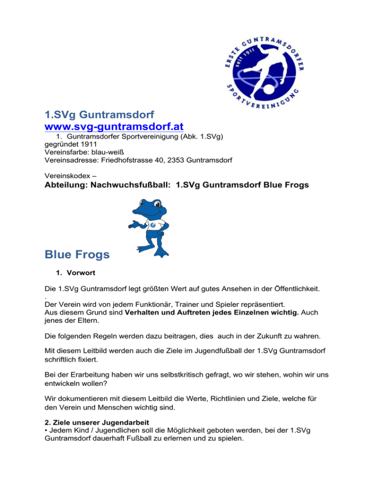 1.SVg Guntramsdorf www.svg-guntramsdorf.at 1. Guntramsdorfer Sportvereinigung (Abk. 1.SVg) gegründet 1911 Vereinsfarbe: blau-weiß Vereinsadresse: Friedhofstrasse 40, 2353 Guntramsdorf Vereinskodex – Abteilung: Nachwuchsfußball: 1.SVg Guntramsdorf Blue Frogs Blue Frogs 1. Vorwort Die 1.SVg Guntramsdorf legt größten Wert auf gutes Ansehen in der Öffentlichkeit. . Der Verein wird von jedem Funktionär, Trainer und Spieler repräsentiert. Aus diesem Grund sind Verhalten und Auftreten jedes Einzelnen wichtig. Auch jenes der Eltern. Die folgenden Regeln werden dazu beitragen, dies auch in der Zukunft zu wahren. Mit diesem Leitbild werden auch die Ziele im Jugendfußball der 1.SVg Guntramsdorf schriftlich fixiert. Bei der Erarbeitung haben wir uns selbstkritisch gefragt, wo wir stehen, wohin wir uns entwickeln wollen? Wir dokumentieren mit diesem Leitbild die Werte, Richtlinien und Ziele, welche für den Verein und Menschen wichtig sind. 2. Ziele unserer Jugendarbeit • Jedem Kind / Jugendlichen soll die Möglichkeit geboten werden, bei der 1.SVg Guntramsdorf dauerhaft Fußball zu erlernen und zu spielen. • Kinder und Jugendliche sollen an den Fußballsport herangeführt, bestmöglich ausgebildet werden. • Die Jugendfußballspieler/innen und auch die Eltern sollen sich bei der 1.SVg wohl fühlen. • Bei Problemen sollen die Verantworltichen informiert und zu einem Gespräch dazu kommen. 3. Grundsätze unserer Jugendarbeit • Im Mittelpunkt der Jugendarbeit stehen immer die Kinder und Jugendlichen und deren sportliche und soziale Entwicklung. • Kindern und Jugendlichen soll vor allem Spaß am "Mannschafts-Spiel" Fußball vermittelt werden und große Freude an der beliebtesten Sportart entwickeln. • Wir reden miteinander, nicht übereinander. Offene und ehrliche Kommunikation ist eine Grundvoraussetzung für erfolgreiche Jugendarbeit • Grundsätzlich sollte die Entwicklung der Kinder, und nicht der kurzfristige sportliche Erfolg im Vordergrund stehen. • Kinder und Jugendliche dürfen nicht überfordert werden. Kinderfußball ist kein Jugendfußball. Jugendfußball ist kein reduzierter Erwachsenenfußball. Deshalb müssen die Anforderungen im Training auf die unterschiedlichen Al-tersgruppen abgestimmt werden. • Wir fördern Selbstwertgefühl durch Anerkennung, konstruktive Kritik und fachliche und soziale Kompetenz. • Wir streben den bestmöglichen sportlichen Erfolg an. Der entscheidende Ausgangspunkt ist aber, dass unsere Kinder und Jugendliche mit Spaß bei der Sache sind und sich bei uns wohl fühlen. • Wir wollen den Kindern Disziplin und Verantwortung nahe legen und so einen Beitrag zur persönlichen Weiterentwicklung leisten. . 4. Die Jugendleitung Die Jugendleitung ist bei uns ein Team. Jeder hat ein Verantwortungsgebiet, welches er zuverlässig abdeckt. • repräsentiert die Jugendabteilung gegenüber der Öffentlichkeit • ist verantwortlich für die Organisation der Jugendabteilung • ist Bindeglied und Ansprechpartner für den Vorstand im Verein • Organisiert und leitet die Trainer-/Betreuersitzungen • Organisiert die Trainer/Betreuer für die Jugendmannschaften • schafft bestmögliche Rahmenbedingungen für die Jugendabteilung. Verhaltenskodex Spieler 1. Respekt Zwischen Trainer und Jugendspieler einerseits und unter sämtlichen Jugendspielern der 1.SVg andererseits besteht ein vertrauensvolles Klima mit gegenseitiger Wertschätzung und Respekt. 2. Pünktlichkeit Das heißt: • Rechtzeitige Anwesenheit vor Spiel- und Trainingsbeginn. • Der Jugendspieler soll eine Viertelstunde vor Trainingsbeginn da sein. • Bei Spielen werden die Treffpunktzeiten von den Trainern vorgegeben. • Die benötigten Trainingsutensilien (der Witterung entsprechende Trainingsbekleidung, Schienbeinschoner, Stutzen, saubere Sportschuhe, Trinkflasche, Ball – sofern ausgegeben) sind vom Spieler mitzubringen. • Der Ball ist erst nach Anweisung der Trainer zu benutzen und verbleibt bis dahin nach Möglichkeit in der Tasche. • Das Spielfeld wird erst nach Anweisung der Trainer betreten. • Bei etwaiger Verhinderung ist der Spieler rechtzeitig zu entschuldigen. • Treffpunkt ist der entsprechende Umkleideraum oder das Sportgelände, je nach Aussage des Trainers. • In der Halle sollen spezielle Hallenschuhe getragen werden. Diese sind aber erst in der Umkleidekabine anzuziehen. 3. Zuverlässigkeit Fußballtraining und das Fußballspiel bietet eine sinnvolle Freizeitgestaltung und Körperertüchtigung. Fußball sollte einen hohen Stellenwert bei den Spielern haben. Es handelt sich um eine Mannschaftssportart, daher hängen vom Einzelnen viele Faktoren und Werte ab. 4. Fairness • Wir vermeiden absichtliche Fouls, Beschimpfungen, Beleidigungen oder Provokationen. • Schiedsrichter-/ Trainerentscheidungen werden ohne Kommentar akzeptiert. Der Spieler stellt sich in den Dienst der Mannschaft. Es zählt nur der gemeinsame Erfolg. 5. Bereitschaft und Wollen Konzentrierte Teilnahme des Jugendspielers beim Training sowie beim Spiel. Den Anordnungen des Trainers ist Folge zu leisten. Die vorgegebenen Übungen sind mit größtem Einsatz und entsprechend der Fähigkeiten ordnungsgemäß durchzuführen. Störungen werden getadelt. Jede Störung stört auch alle anderen Spieler und ist daher zu verhindern. Die Spieler sollten sich mannschaftlich verhalten, denn jede Störung stört auch alle anderen Spieler. 6. Mitarbeit und Verantwortung • Die Jugendspieler müssen sich vor Trainingsbeginn beim Aufbau der Trainingseinheiten und nach dem Trainingsende an deren Abbau beteiligen. • Mit den vom Verein gestellten Trainings- und Spielmaterialen ist sorgsam umzugehen. So hat z.B. jeder für seinen Trainingsball Sorge zu tragen. • Schmutzige Bälle und Trainingsmaterial sind zu säubern, ehe sie zurückgeräumt werden. • Trikots und Trainingsleibchen müssen ordentlich zurückgeräumt werden. Nach dem Spiel ist der Trikotsatz zu zählen, damit kein Teil verloren geht. • E
