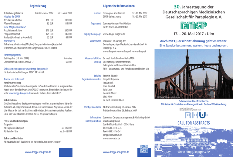 Registrierung Teilnahmegebühren bis 28. Februar 2017 ab 1. März 2017 Mitglied der DMGP Arzt/Wissenschaftler 160 EUR 190 EUR Pfleger/Therapeut 95 EUR 115 EUR Nicht-Mitglied der DMGP Arzt/Wissenschaftler 210 EUR 240 EUR Pfleger/Therapeut 125 EUR 145 EUR Student (Nachweis erforderlich) 65 EUR 65 EUR Arbeitskreise Teilnahme Arbeitskreise (Mitglied, Kongressteilnehmer)kostenfrei Teilnahme Arbeitskreise (Nicht-Kongressteilnehmer) 3 0 EUR Rahmenprogramm Get-Together (18. Mai 2017) Gesellschaftsabend (19. Mai 2017) inklusive 60 EUR Onlineanmeldung unter www.dmgp-kongress.de. Für telefonische Rückfragen 03641 31 16-160. Anreise und Unterkunft Hotelreservierung Wir haben für Sie Zimmerkontingente zu Sonderkonditionen in ausgewählten Hotels unter dem Stichwort „DMGP2017“ reserviert. Bitte finden Sie dies auf der Seite www.dmgp-kongress.de unter der Rubrik „Anreise&Hotels“. Mit dem Auto Die Ulm-Messe liegt direkt am Ortseingang von Ulm, in unmittelbarer Nähe der Autobahn A 8. Folgen Sie einfach den ca. 3 m hohen blauen Wegweiser-Stelen der Ulm-Messe, die sich am Straßenrand befinden. Bei Autobahnanfahrt: Ausfahrt „Ulm Ost“ und ebenfalls den Ulm-Messe Wegweisern folgen. Preise und Verbindungen Taxipreise Ab Flughafen Stuttgart Ab Bahnhof Ulm ca. 120 EUR ca. 9–12 EUR Bahn- und Buslinien Ab Hauptbahnhof: Bus Linie 6 bis Haltestelle „Congress Centrum“ www.dmgp-kongress.de 30. Jahrestagung der Allgemeine Informationen Termine Sitzung der Arbeitskreise DMGP-Jahrestagung 17.-18. Mai 2017 18.-20. Mai 2017 Deutschsprachigen Medizinischen Gesellschaft für Paraplegie e. V. Tagungsort Congress Centrum Ulm/Maritim Basteistraße 40 • 89073 Ulm Tagungshomepage www.dmgp-kongress.de Veranstalter Conventus im Auftrag der Deutschsprachigen Medizinischen Gesellschaft für Paraplegie e. V. www.dmgp.de • www.dmgp.ch • www.dmgp.at 17. – 20. Mai 2017 • Ulm Auch mit Querschnittlähmung geht es weiter! Eine Standortbestimmung gestern, heute und morgen. Wissenschaftliche Dr. med. Yorck-Bernhard Kalke MBA Leitung Querschnittgelähmtenzentrum Orthopädische Universitätsklinik Ulm RKU – Universitäts- und Rehabilitationskliniken Ulm Lokales Joachim Bäuerle Organisationskomitee Leopold Dejworek Ina Jungnik Ellen Keuchel Julia Laun Dominik Mayer Viola Meer Dr. med. Cornelia Ribeill Wichtige Deadlines Abstracteinreichung 31. Januar 2017 Frühbucherdeadline 28. Februar 2017 Information Conventus Congressmanagement & Marketing GmbH und Organisation Claudia Voigtmann Carl-Pulfrich-Straße 1 • 07745 Jena Tel. 03641 31 16-335 Fax 03641 31 16-241 [email protected] www.conventus.de www.dmgp-kongress.de © Wolfgang Pehlemann l wikimedia.org Schirmherr: Manfred Lucha Minister für Soziales und Integration in Baden-Württemberg Call for Abstracts www.dmgp-kongress.de Grußwort Liebe DMGP´ler und an der 30. Jahrestagung der DMGP Interessierte, der 30. Hochzeitstag ist die Perlenhochzeit und solch eine Perle stellt auch unsere Deutschsprachige Medizinische Gesellschaft für Paraplegie dar. Bereits in den Anfängen wurde Wert auf die partnerschaftliche und multiprofessionelle Zusammenarbeit aller in der Behandlung Querschnittgelähmter beteiligten Berufsgruppen gelegt. Heute wird die DMGP von der Tätigkeit, dem Wissen und der Erfahrung der jeweiligen Arbeitskreise getragen, die im Vorfeld der Jahrestagung am 17. und 18. Mai 2017 zusammenkommen werden. Unsere Jubiläumstagung vom 18. bis 20. Mai 2017 wird beweisen, dass es auch mit Querschnittlähmung weitergeht. Hierbei wird auf Historisches, Gegenwärtiges und Zukünftiges eingegangen werden. Die ausgesuchten Schwerpunktthemen bieten genauso wie unsere Sponsoren und Aussteller und die Einbeziehung von ASBH, ISPRM und ISCoS sicherlich ein abwechslungsreiches Programm. Festredner werden der Benediktinerpater Anselm Grün und der Neurowissenschaftler Manfred Spitzer, unsere internationalen Festgäste Nazirah Hasnan aus Malaysia, Stephen Muldoon aus Nordirland und Francois Theron aus Südafrika sein. Jeanne Altfeld wird für die musikalische Unterhaltung sorgen. Denn eine Jahrestagung der DMGP bedeutet zugleich Freunde und Freude. Tagungsort über die gesamten Tage wird das barrierefreie Congress Centrum Ulm sein. Dies hat den Vorteil, dass wir uns alle unter einem Dach treffen und damit die Wege zueinander, aber auch in die Ulmer Innenstadt am Donauufer entlang äußerst kurz sind, denn es gilt die Geburtsstadt von Albert Einstein mit dem höchsten Kirchturm und dem berühmtesten Spatzen der Welt kennenzulernen. Abstracteinreichung und Programm Lokaler Partner Wir möchten Sie recht herzlich einladen, gemeinsam mit uns das Programm der Jahrestagung zu gestalten und Ihre Abstracts zu den Schwerpunktthemen und allgemeinen Themen der Tagung einzureichen. Die Abstract-Einreichung erfolgt ausschließlich online unter www.dmgp-kongress.de in deutscher Sprache. Sponsoren und Aussteller Deadline für die Abstracteinreichung ist der 31. Januar 2017! Thema Auch mit Querschnittlähmung geht es weiter! Eine Standortbestimmung gestern, heute und morgen! Coloplast GmbH (Hamburg) Schwerpunktthemen •Osteoporose und weitere querschnittbedingte Komplikationen • Die respiratorische Problematik • Partizipation und Lebensqualität • Neuro-Urologie und Sexualität •Spina bifida und kindliche Querschnittlähmung • Exoskelett und Robotics • Dauerbrenner Infektion und Keime •Freie Themen Rahmenprogramm 18. Mai 2017 Get-Together in der Industrieausstellung 19. Mai 2017 Gesellschaftsabend im Maritim Hotel Ulm Das gesamte Team des Querschnittgelähmtenzentrums Ulm freut sich auf Sie! Ihr Dr. med. Yorck-Bernhard Kalke MBA Sektionsleiter Querschnittgelähmtenzentrum Ulm RKU – Universitäts- und Rehabilitationskliniken Ulm 2. Vorsitzender DMGP www.dmgp-kongress.de Goldsponsor Hollister Incorporated (München) Bronzesponsor Ekso Bionics Europe GmbH (Freiburg) Aussteller Coloplast GmbH (Hamburg) C. R. Bard GmbH (Karlsruhe) Ekso Bionics Europe GmbH (Freiburg) FIOR & G
