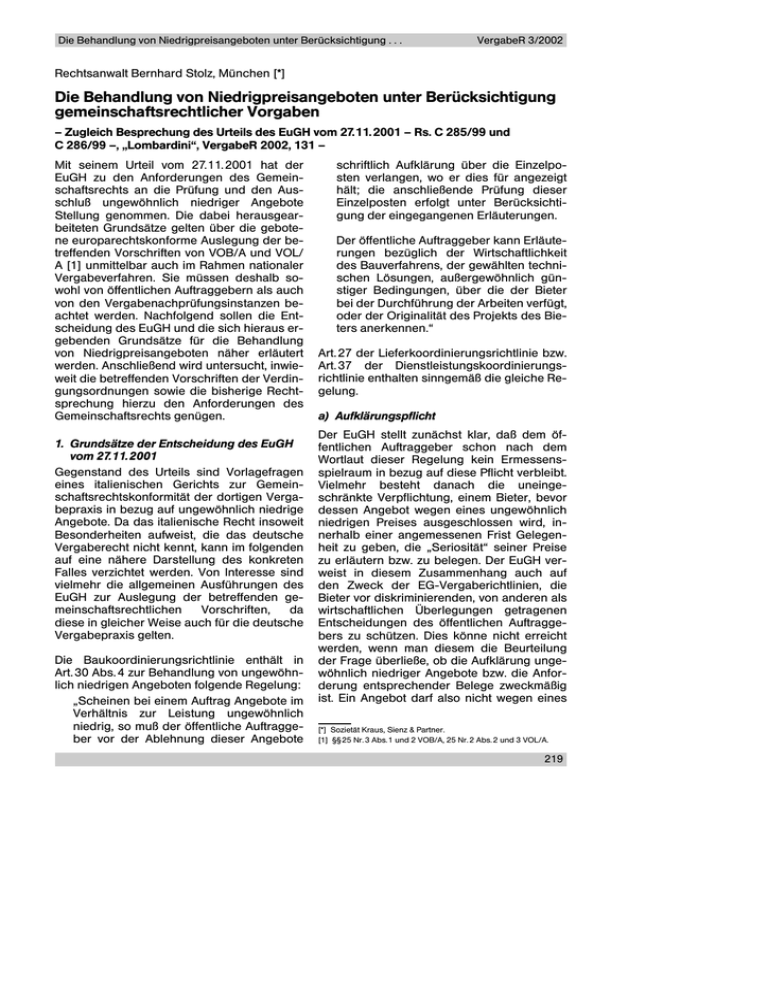 Die Behandlung von Niedrigpreisangeboten unter Berücksichtigung . . . VergabeR 3/2002 Rechtsanwalt Bernhard Stolz, München [*] Die Behandlung von Niedrigpreisangeboten unter Berücksichtigung gemeinschaftsrechtlicher Vorgaben … Zugleich Besprechung des Urteils des EuGH vom 27.11. 2001 … Rs. C 285/99 und C 286/99 …, „Lombardini“, VergabeR 2002, 131 … Mit seinem Urteil vom 27.11. 2001 hat der EuGH zu den Anforderungen des Gemeinschaftsrechts an die Prüfung und den Ausschluß ungewöhnlich niedriger Angebote Stellung genommen. Die dabei herausgearbeiteten Grundsätze gelten über die gebotene europarechtskonforme Auslegung der betreffenden Vorschriften von VOB/A und VOL/ A [1] unmittelbar auch im Rahmen nationaler Vergabeverfahren. Sie müssen deshalb sowohl von öffentlichen Auftraggebern als auch von den Vergabenachprüfungsinstanzen beachtet werden. Nachfolgend sollen die Entscheidung des EuGH und die sich hieraus ergebenden Grundsätze für die Behandlung von Niedrigpreisangeboten näher erläutert werden. Anschließend wird untersucht, inwieweit die betreffenden Vorschriften der Verdingungsordnungen sowie die bisherige Rechtsprechung hierzu den Anforderungen des Gemeinschaftsrechts genügen. 1. Grundsätze der Entscheidung des EuGH vom 27.11. 2001 Gegenstand des Urteils sind Vorlagefragen eines italienischen Gerichts zur Gemeinschaftsrechtskonformität der dortigen Vergabepraxis in bezug auf ungewöhnlich niedrige Angebote. Da das italienische Recht insoweit Besonderheiten aufweist, die das deutsche Vergaberecht nicht kennt, kann im folgenden auf eine nähere Darstellung des konkreten Falles verzichtet werden. Von Interesse sind vielmehr die allgemeinen Ausführungen des EuGH zur Auslegung der betreffenden gemeinschaftsrechtlichen Vorschriften, da diese in gleicher Weise auch für die deutsche Vergabepraxis gelten. Die Baukoordinierungsrichtlinie enthält in Art. 30 Abs. 4 zur Behandlung von ungewöhnlich niedrigen Angeboten folgende Regelung: „Scheinen bei einem Auftrag Angebote im Verhältnis zur Leistung ungewöhnlich niedrig, so muß der öffentliche Auftraggeber vor der Ablehnung dieser Angebote schriftlich Aufklärung über die Einzelposten verlangen, wo er dies für angezeigt hält; die anschließende Prüfung dieser Einzelposten erfolgt unter Berücksichtigung der eingegangenen Erläuterungen. Der öffentliche Auftraggeber kann Erläuterungen bezüglich der Wirtschaftlichkeit des Bauverfahrens, der gewählten technischen Lösungen, außergewöhnlich günstiger Bedingungen, über die der Bieter bei der Durchführung der Arbeiten verfügt, oder der Originalität des Projekts des Bieters anerkennen.“ Art. 27 der Lieferkoordinierungsrichtlinie bzw. Art. 37 der Dienstleistungskoordinierungsrichtlinie enthalten sinngemäß die gleiche Regelung. a) Aufklärungspflicht Der EuGH stellt zunächst klar, daß dem öffentlichen Auftraggeber schon nach dem Wortlaut dieser Regelung kein Ermessensspielraum in bezug auf diese Pflicht verbleibt. Vielmehr besteht danach die uneingeschränkte Verpflichtung, einem Bieter, bevor dessen Angebot wegen eines ungewöhnlich niedrigen Preises ausgeschlossen wird, innerhalb einer angemessenen Frist Gelegenheit zu geben, die „Seriosität“ seiner Preise zu erläutern bzw. zu belegen. Der EuGH verweist in diesem Zusammenhang auch auf den Zweck der EG-Vergaberichtlinien, die Bieter vor diskriminierenden, von anderen als wirtschaftlichen Überlegungen getragenen Entscheidungen des öffentlichen Auftraggebers zu schützen. Dies könne nicht erreicht werden, wenn man diesem die Beurteilung der Frage überließe, ob die Aufklärung ungewöhnlich niedriger Angebote bzw. die Anforderung entsprechender Belege zweckmäßig ist. Ein Angebot darf also nicht wegen eines [*] Sozietät Kraus, Sienz & Partner. [1] §§ 25 Nr. 3 Abs.1 und 2 VOB/A, 25 Nr. 2 Abs. 2 und 3 VOL/A. 219 VergabeR 3/2002 ungewöhnlich niedrigen Preises ausgeschlossen werden, wenn dem betreffenden Bieter zuvor keine Gelegenheit zur Erläuterung seiner Preise gegeben wurde. b) Aufklärungsumfang Der Gerichtshof hat weiter entschieden, daß der zweite Unterabsatz der betreffenden Regelungen keinen abschließenden Katalog der vorbringbaren Erläuterungen aufstellt, sondern lediglich Beispiele von Erläuterungen nennt, die der Bieter einreichen kann, um die Seriosität der angebotenen Preise zu belegen. Es sei daher nicht gestattet, bestimmte Arten von Erläuterungen auszuschließen oder unberücksichtigt zu lassen. Es stünde der Entwicklung eines wirksamen Wettbewerbs auf dem Gebiet des öffentlichen Auftragswesens entgegen, wenn Angebote mit günstigen Preisen ausgeschlossen werden könnten, obwohl sich deren Seriosität begründen läßt, nur weil die betreffenden Erwägungen nicht zugelassen werden. Der öffentliche Auftraggeber ist deshalb verpflichtet, sämtliche vom Unternehmer vorgebrachten Erläuterungen zu berücksichtigen, bevor er über die Zulassung oder die Ablehnung des fraglichen Angebots entscheidet. c) Aufklärungsverfahren Der Gerichtshof bezeichnet das nach den zitierten Vorschriften zwingend zu beachtende Verfahren als „kontradiktorische Überprüfung“ der als ungewöhnlich niedrig angesehenen Angebote. Danach muß der Auftraggeber nach Kenntnisnahme aller Angebote zunächst die zweifelhaften Angebote ermitteln. Anschließend ist dem betroffenen Bieter Gelegenheit zu geben, die Seriosität seiner Preise darzutun, indem von ihm schriftlich Aufklärung verlangt wird über diejenigen Elemente des Angebots, die Zweifel hervorgerufen haben. Dabei ist eine angemessene Frist zu setzen. Anschließend ist die Stichhaltigkeit der von den Betroffenen eingereichten Erklärungen zu beurteilen. Dabei sind alle Erläuterungen uneingeschränkt zu berücksichtigen. Erst danach ist über die Zulassung oder die Ablehnung dieser Angebote zu entscheiden. Der Ausschluß eines Angebots wegen eines ungewöhnlich niedrigen Preises setzt zwingend die Durchführung eines solchen kont