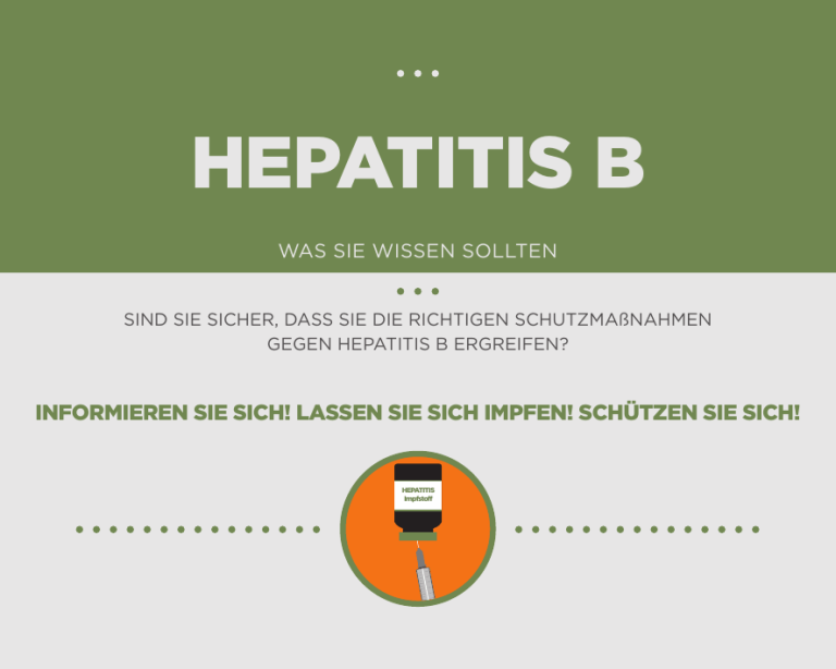 HEPATITIS B WAS SIE WISSEN SOLLTEN SIND SIE SICHER, DASS SIE DIE RICHTIGEN SCHUTZMAßNAHMEN GEGEN HEPATITIS B ERGREIFEN? INFORMIEREN SIE SICH! LASSEN SIE SICH IMPFEN! SCHÜTZEN SIE SICH! HEPATITIS Impfstoff WUSSTEN SIE, DASS Hepatitis B die Leber angreift und eine akute, in manchen Fällen lebensbedrohliche Krankheit zur Folge haben kann? AUF DER GANZEN WELT die häufigste Krankenhausinfektion ist? 2 eine lebenslange Infektion mit Hepatitis B , wenn diese unbehandelt bleibt, später zu Leberkrebs führen kann? Milliarden Menschen sind von Hepatitis B betroffen Jedes Jahr sterben ca. 1.000.000 Menschen an den Auswirkungen einer Hepatitis B-Infektion WANN UND WIE KANN ICH MICH GEGEN HEPATITIS B IMPFEN LASSEN? Der Hepatitis B-Impfstoff enthält gentechnisch hergestelltes Eiweißmaterial des Virus und sollte im Rahmen eines Drei- Dosen-Impfschemas in den Monaten 0-1-6 intramuskulär verabreicht werden. Ein bis zwei Monate nach Verabreichung der 3. Dosis wird für im Gesundheitswesen tätige Personen empfohlen, einen Test durchzuführen, um sicherzustellen, dass sich in ausreichendem Maße Antikörper gebildet haben. Der Antikörperschutz hält vermutlich länger als 20 Jahre. HEPATITIS Impfstoff WER SOLLTE GEGEN HEPATITIS B GEIMPFT WERDEN? Gesundheitspersonal, das in Kontakt mit Patienten kommt, sollte gegen Hepatitis B geimpft werden. Nach einer möglichen Exposition, z. B. einem Nadelstich oder anderem Unfall, sollte Gesundheitspersonal, das nicht geimpft ist, die erste Dosis der Impfung sobald als möglich erhalten. Jeder, der ein Familienmitglied hat, das Träger des Hepatitis B-Virus ist. Reisende, die Länder mit hohem Hepatitis-B-Risiko aufsuchen. (z. B. Süd-Ost-Asien, Sub-Sahara Afrika, das Amazonasbecken, Teile des Nahen Ostens, der zentralasiatischen Republiken und einige Teile Osteuropas). Jeder Erwachsene, der noch nicht immunisiert wurde, sollte eine Hepatitis-B-Impfung erhalten. WANN UND WIE KANN ICH MICH GEGEN HEPATITIS B IMPFEN LASSEN? 1 DOSIS bietet zu 50% wirksamen Schutz gegen Hepatitis 2 3 DOSEN DOSEN ΔΟΣΕΙΣ bieten zu 75-80% wirksamen Schutz gegen Hepatitis B bieten 95% Schutz vor Hepatitis KURZINFORMATIONEN ZUR KRANKHEIT Hepatitis B ist in Europa und weltweit weiterhin sehr verbreitet. In Europa entfällt die Mehrheit der Fälle auf die Altersgruppe der 25-34 jährigen Personen. SYMPTOME Die Symptome zeigen sich bei Patienten meistens 30-90 Tage nach der Infektion. Einige Patienten zeigen sehr milde Symptome, andere zeigen typische Symptome einer Leberinfektion und einige entwickeln eine schwere Leberinfektion. Gelbsucht (gelbe Färbung der Haut und Augen) ist ein typisches Symptom, wenngleich es nicht immer auftritt. Patienten mit einer Hepatitis B können außerdem unter folgenden Symptomen leiden: dunkler Urin, Ermüdung, Appetitlosigkeit, Übelkeit, Erbrechen, Unterleibsschmerzen und Gelenkschmerzen. BEHANDLUNG Gegenwärtig gibt es keine bestimmte Behandlungsmethode für akute Hepatitis B-Infektionen. Für gewöhnlich wird eine unterstützende Therapie benötigt. Neue antivirale Wirkstoffe kommen bei chronischen Hepatitis B-Infektionen zur Anwendung. RISIKEN EINER HEPATITIS-B-INFEKTION RISIKEN EINER HEPATITIS-B-IMPFUNG • Lebreinfektion, die ein Absterben der Leberzellen nach sich zieht Mild (häufig) • Hepatitis-B-Träger lebenslange Hepatitis B-Infektion (bei bis zu 5-10% der Erwachsenen) • Leberzirrhose (15-40%) • Leberkrebs (in den Folgejahren einer lebenslangen Hepatis B-Infektion, wenn diese unbehandelt bleibt) • Tod •Rötung an der Injektionsstelle •Lokaler Schmerz an der Injektionsstelle •Schwellungen auf der Injektionsstelle •Kopfschmerzen •Schwaches Fieber Moderat (selten) • Erschöpfung Schwer (sehr selten): • Anaphylaktischer Schock (1/600.000 Dosen) WO FINDE ICH WEITERE INFORMATIONEN? 1. Impfkalender STIKO 2013: http://www.rki.de/DE/Content/Kommissionen/STIKO/ Empfehlungen/Impfempfehlungen_node.html 2. http://www.rki.de/DE/Content/InfAZ/H/HepatitisB/HepatitisB.html 3. Unabhängige Patientenberatung Deutschland e. V (www.updonline.de oder bundesweites, kostenloses Beratungstelefon 0800 011 77 22) 4. Impfberatungsstellen der örtlichen Gesundheitsämter 5. www.impfen-info.de 6. WHO Europe: www.euro.who.int, search for immunization resources 7. www.who.int 8. www.cdc.gov 9. www.vaccines.gov 10. www.vaccineinformation.org 11. www.ncirs.edu.au 12. Immunization Action Coalition (IAC): www.immunize.org and the logo (see english document) Co-funded by the Health Programme of the European Union