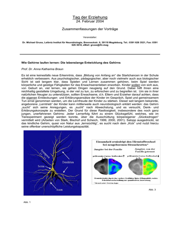 Tag der Erziehung 24. Februar 2004 Zusammenfassungen der Vorträge Veranstalter: Dr. Michael Gruss, Leibniz Institut für Neurobiologie, Brenneckstr. 6, 39118 Magdeburg, Tel.: 0391 626 3521, Fax: 0391 626 3618, eMail: gruss@ifn-mag Wie Gehirne laufen lernen: Die lebenslange Entwicklung des Gehirns Prof. Dr. Anna Katharina Braun Es ist eine keinesfalls neue Erkenntnis, dass „Bildung von Anfang an“ die Startchancen in der Schule erheblich verbessern. Aus psychologischer, pädagogischer, aber noch vielmehr auch aus biologischer Sicht ist seit langem klar, dass Spielen und Lernen zusammen gehören, beim Spiel werden körperliche und geistige Fähigkeiten für das Erwachsenenleben erworben. Kinder wollen von sich aus, von Geburt an, viel lernen, sie gehen Dingen neugierig auf den Grund. Dabei hilft ihnen eine reichhaltig gestaltete Umgebung, in der viel zu tun, zu erforschen und zu begreifen ist. Um sie in ihrer natürlichen Neugier zu unterstützen, sollten Erwachsene, d.h. Eltern und Erzieher darauf achten, dass die eigenen Entdeckungen und Erklärungsansätze der Kinder im Gespräch, Spiel und gemeinsamem Tun ernst genommen werden, um die Lernfreude der Kinder zu stärken. Dieser seit langem bekannte, angeborene „Lerntrieb“ der Kinder kann mittlerweile auch neurobiologisch erklärt werden: das Gehirn „sucht“ sich seine Anregungen, es „sucht“ nach Abwechslung, und es versucht, Denk- und Erklärungskonzepte zu erstellen. Der Grund für diese Rastlosigkeit, insbesondere des noch ganz jungen, unerfahrenen Gehirns: Jeder Lernerfolg führt zu einem Glücksgefühl, welches, wie im Tierexperiment gezeigt werden konnte, über die Ausschüttung körpereigener „Glücksdrogen“ vermittelt wird (Arbeiten von Stark, Bischof und Scheich, 1999, 2000, 2001). Salopp ausgedrückt, ist das kindliche Gehirn, quasi von Natur aus „lernsüchtig“, es sucht nach dem „Kick“ und nutzt hierzu seine offenbar unerschöpfliche Leistungskapazität. Abb. 3 Abb. 1 Abb. 2 Ein wichtiger und ganz entscheidender Unterschied zwischen dem erwachsenen, erfahrenen Gehirn und dem kindlichen noch unreifen, im Wachstum befindlichen Gehirn ist jedoch, dass kognitive vor allem aber auch emotionale Erfahrungen im kindlichen Gehirn viel massivere, und auch dauerhaftere Spuren hinterlassen als im erwachsenen Gehirn, wo nur noch vergleichsweise subtile Veränderungen beim Lernen stattfinden. In jeder Entwicklungsphase des Gehirns werden über Erfahrungen und Lernvorgänge neuronale Strukturen „geprägt“, die das hirnbiologische Substrat für alle weiteren Lernprozesse bis zum Erwachsenenalter bilden. In anderen Worten: frühe Sinneseindrücke, Erfahrungen und Lernprozesse werden hirnbiologisch betrachtet dazu benutzt, die Entwicklung und Ausreifung der noch unreifen funktionellen Schaltkreise im Gehirn zu optimieren. Während dieser kritischen oder „sensiblen“ Zeitfenster werden die Denkkonzepte, die „Grammatik“ für späteres Lernen, und auch für die mit jedem Lernprozess untrennbar verknüpfte emotionale Erlebniswelt angelegt. Auch Gefühle, positive wie auch negative, sind untrennbar mit dem Lernen verknüpft, d.h. es muß größter Wert auf das soziale und emotionale Umfeld gelegt werden! Demzufolge liegt es auf der Hand, dass Versäumnisse während der kritischen Entwicklungszeitfenster, also das Vorenthalten von Gefühlen, Spiel, Erfahrungen, und Lernen und den damit gekoppelten Erfolgs- (Glücks-) Erlebnissen oder das Erzeugen von Entmutigung und Frustration, die Ausreifung der lernrelevanten Hirnsysteme negativ beeinflussen muß (Arbeiten von Braun und Bogerts 2000). Umgekehrt jedoch bietet dieser ausgefeilte hirnbiologische Mechanismus der Umwelt, d.h. den Eltern, Erziehern und Lehrern eine bislang weit unterschätzte Chance, die funktionelle Entwicklung des kindlichen Gehirns dramatisch zu beeinflussen, d.h. biologisch betrachtet, dafür zur sorgen, aus den genetisch vorgeformten Entwicklungsprogrammen das optimale Ergebnis herauszuholen (div. Arbeiten von Helmeke, Bock und Braun 1999, 2000, 2001, 2002). Ein wichtiges Merkmal der frühkindlichen Entwicklungszeitfenster ist, dass sie begrenzt sind, d.h. sie dürfen nicht ungenutzt verstreichen, sondern müssen für die entsprechenden Fähigkeiten (zB. den Spracherwerb u.a.) genutzt werden, denn hier gilt leider, wenn auch nicht in der radikalen Absolutheit, der alte Spruch „Was Hänschen nicht lernt, lernt Hans nimmermehr“. Die kritischen Zeitfenster der psychischen bzw. hirnbiologischen Entwicklung liegen jedoch weit vor der Zeit, in der die schulische Bildung einsetzt, sie liegen vielmehr in den ersten 3 bis 5 Lebensjahren. D.h. „die Schule muß mit der Geburt beginnen“, um bleibende (und im weiteren Leben positiv nutzbare!) Spuren im Gehirn zu hinterlassen. Es sei bereits an dieser Stelle ausdrücklich betont, dass absolut kein Grund zu der Befürchtung besteht, dass das kindliche Gehirn in seiner Leistungskapazität jemals „überfordert“ werden könnte! Was im landläufigen Sinne als „Überforderung“ oder Lernproblem bezeichnet wird, erweist sich bei näherer Betrachtung entweder als Unterforderung, oder schlimmer noch, ist das Ergebnis von langweiligem Pauken und Drill, Entmutigung, Frustration und einer dadurch ausgelöschten Wissbegier und dem Verlust der angeborenen Lust am Lernen. Befunde aus der neurobiologischen Forschung Fragen, von Entwicklungsbiologen wie: Was steuert die Entwicklung des Gehirns, welche Faktoren und Mechanismen sind an der Bildung von Nervenzellen (Abb. 1) und ihren komplexen synaptischen Verschaltungen (Abb.1 und 3) beteiligt? sind ganz eng gekoppelt an Fragen, die sich Eltern und Erzieher stellen: Können diese funktionellen Einheiten des Gehirns bei mangelnder Förderung verkümmern, und wie können wir ihre funktionelle Reifung optimal fördern? In allen Entwicklungsstadien kommt es zu einem subtilen Wechselspiel zwischen genetisch determinierten, d.h. angeborenen, „vorprogrammierten“ zel