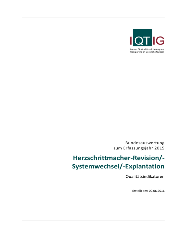 Bundesauswertung zum Erfassungsjahr 2015 Herzschrittmacher-Revision/Systemwechsel/-Explantation Qualitätsindikatoren Erstellt am: 09.06.2016 Impressum Herausgeber: IQTIG – Institut für Qualitätssicherung und Transparenz im Gesundheitswesen Katharina-Heinroth-Ufer 1 10787 Berlin Telefon: (030) 58 58 26-0 Telefax: (030) 58 58 26-999 [email protected] http://www.iqtig.org Bundesauswertung zum Erfassungsjahr 2015 Einleitung Inhaltsverzeichnis Einleitung ................................................................................................................................................................. 5 Datengrundlage ....................................................................................................................................................... 6 Übersicht Qualitätsindikatoren ............................................................................................................................... 7 51987: Hardwareproblem (Aggregat oder Sonde) als Indikation zum Folgeeingriff ............................................... 8 51988: Prozedurassoziiertes Problem (Sonden- oder Taschenproblem) als Indikation zum Folgeeingriff ........... 11 51994: Infektion als Indikation zum Folgeeingriff ................................................................................................. 15 Indikatorengruppe: Perioperative Komplikationen ............................................................................................... 18 1089: Chirurgische Komplikationen .................................................................................................................. 18 52315: Dislokation oder Dysfunktion revidierter bzw. neu implantierter Sonden ........................................... 20 Indikatorengruppe: Sterblichkeit im Krankenhaus ................................................................................................ 23 51399: Sterblichkeit im Krankenhaus ................................................................................................................ 23 51404: Verhältnis der beobachteten zur erwarteten Rate (O / E) an Todesfällen ............................................ 25 Erläuterung ............................................................................................................................................................ 28 Basisauswertung.................................................................................................................................................... 30 Basisdokumentation .......................................................................................................................................... 30 Behandlungszeiten ........................................................................................................................................ 30 Patient ............................................................................................................................................................... 31 Präoperative Anamnese/Klinik .......................................................................................................................... 32 Indikation zur Revision/Explantation des Schrittmacher - Aggregats ............................................................... 33 Spezielle Indikation zur Revision / Explantation von Sonden ........................................................................ 34 Operation .......................................................................................................................................................... 36 Postoperativ funktionell aktive Anteile des SM-Systems .................................................................................. 37 Schrittmachersystem ..................................................................................................................................... 37 Schrittmacher-Aggregat ................................................................................................................................ 37 Schrittmachersonden .................................................................................................................................... 38 Vorhofsonde .................................................................................................................................................. 38 1. Ventrikelsonde .......................................................................................................................................... 40 2. Ventrikelsonde .......................................................................................................................................... 41 Postoperativ funktionell nicht mehr aktive Anteile des SM-Systems ............................................................... 43 Schrittmachersystem ..................................................................................................................................... 43 Schrittmacher-Aggregat ................................................................................................................................ 43 Schrittmachersonden .................................................................................................................................... 45 Vorhof ............................................................................................................................................................ 45 1. Ventrikelsonde .......................................................................................................................................... 46 2. Ventrikelsonde .......................................................................................................................................... 47 Komplikationen ................................................................................................................................................. 48 © 2016 IQTIG Seite 3/51 Bundesau