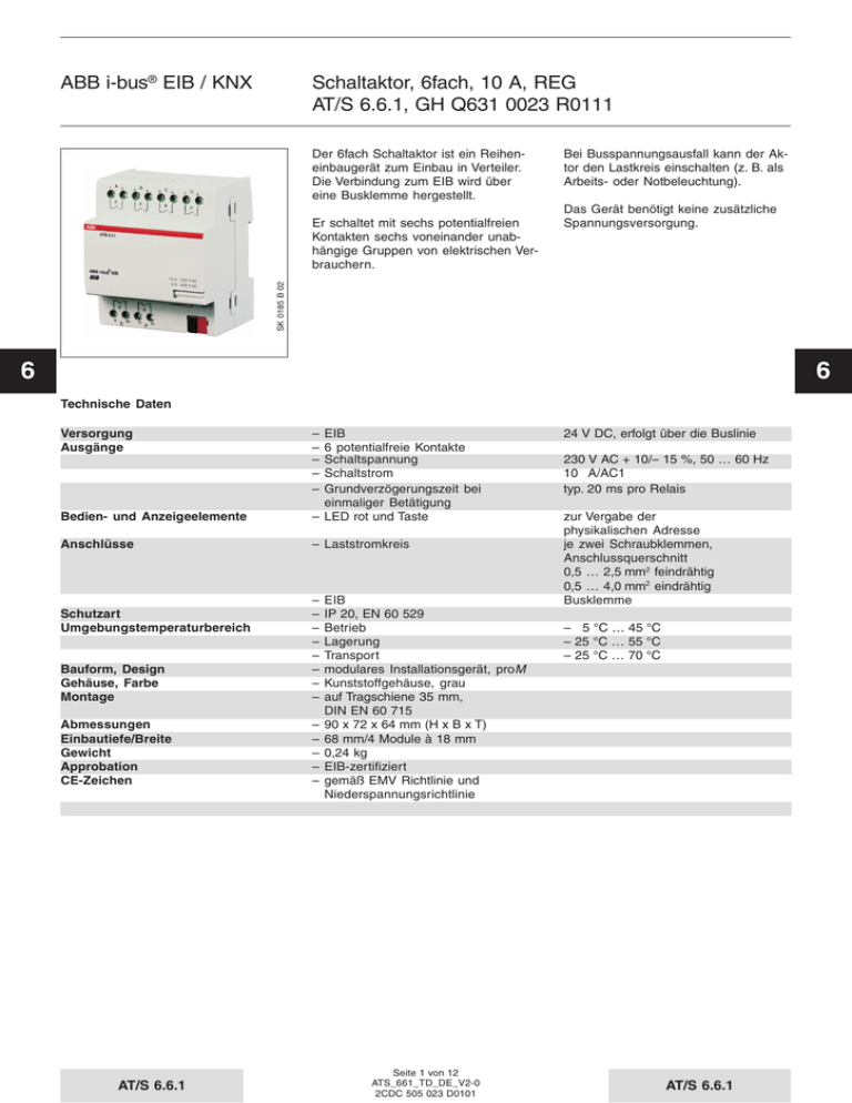 ABB i-bus® EIB / KNX Schaltaktor, 6fach, 10 A, REG AT/S 6.6.1, GH Q631 0023 R0111 Der 6fach Schaltaktor ist ein Reiheneinbaugerät zum Einbau in Verteiler. Die Verbindung zum EIB wird über eine Busklemme hergestellt. Das Gerät benötigt keine zusätzliche Spannungsversorgung. SK 0185 B 02 Er schaltet mit sechs potentialfreien Kontakten sechs voneinander unabhängige Gruppen von elektrischen Verbrauchern. Bei Busspannungsausfall kann der Aktor den Lastkreis einschalten (z. B. als Arbeits- oder Notbeleuchtung). 6 6 Technische Daten Versorgung Ausgänge – – – – – Bedien- und Anzeigeelemente EIB 6 potentialfreie Kontakte Schaltspannung Schaltstrom Grundverzögerungszeit bei einmaliger Betätigung – LED rot und Taste Anschlüsse – Laststromkreis Bauform, Design Gehäuse, Farbe Montage – – – – – – – – Abmessungen Einbautiefe/Breite Gewicht Approbation CE-Zeichen – – – – – Schutzart Umgebungstemperaturbereich AT/S 6.6.1 EIB IP 20, EN 60 529 Betrieb Lagerung Transport modulares Installationsgerät, proM Kunststoffgehäuse, grau auf Tragschiene 35 mm, DIN EN 60 715 90 x 72 x 64 mm (H x B x T) 68 mm/4 Module à 18 mm 0,24 kg EIB-zertifiziert gemäß EMV Richtlinie und Niederspannungsrichtlinie Seite 1 von 12 ATS_661_TD_DE_V2-0 2CDC 505 023 D0101 24 V DC, erfolgt über die Buslinie 230 V AC + 10/– 15 %, 50 … 60 Hz 10 A/AC1 typ. 20 ms pro Relais zur Vergabe der physikalischen Adresse je zwei Schraubklemmen, Anschlussquerschnitt 0,5 … 2,5 mm2 feindrähtig 0,5 … 4,0 mm2 eindrähtig Busklemme – 5 °C … 45 °C – 25 °C … 55 °C – 25 °C … 70 °C AT/S 6.6.1 ABB i-bus® EIB / KNX Schaltaktor, 6fach, 10 A, REG AT/S 6.6.1, GH Q631 0023 R0111 Anwendungsprogramme Anzahl Kommunikationsobjekte 12 12 6 6 12 5 Schalten Logik Vorzug /3 Schalten Status Vorzug /1 Schalten Vorzug Zeit /3 Schalten Vorzug Trepph.fkt /3 Schalten Priorität Status Vorzug /6 Gebläsekonv. 4-Leiter Heizen u. Kühlen /1 max. Anzahl Gruppenadressen 16 18 18 21 14 5 max. Anzahl Zuordnungen 17 18 18 22 14 5 6 6 Maßbild 58 72 90 45 44 Anschlussbild 1 3 4 5 Hinweise AT/S 6.6.1 SK ____ Z96 2 1 Anschlussklemmen Ausgänge A…D 2 Anschlussklemmen Ausgänge E…F 3 Programmiertaste 4 Programmier-LED 5 Busklemme Um gefährliche Berührungsspannung durch Rückspeisung aus unterschiedlichen Außenleitern zu vermeiden, muss eine allpolige Abschaltung eingehalten werden. Werden die Ausgänge kurz hintereinander mehrfach geschaltet, verlängert sich die Grundverzögerungszeit Seite 2 von 12 ATS_661_TD_DE_V2-0 2CDC 505 023 D0101 AT/S 6.6.1 ABB i-bus® EIB / KNX Schaltaktor, 6fach, 10 A, REG AT/S 6.6.1, GH Q631 0023 R0111 Schalten Logik Vorzug /3 Das Anwendungsprogramm bietet für jeden Ausgang die gleichen Parameter und Kommunikationsobjekte. 6 Auswahl in der ETS2 – ABB Ausgabe Binärausgang 6fach 6 Schalten In der Standardeinstellung schaltet der Aktor das Relais nach Empfang eines Telegramms mit dem Wert “1” ein und nach Empfang eines Telegramms mit dem Wert “0” aus. Wenn der Parameter “Schaltverhalten” auf “Öffner” eingestellt ist, schaltet der Aktor das Relais nach Empfang eines Telegramms mit dem Wert “0” ein und nach Empfang eines Telegramms mit dem Wert “1” aus. Logik Normalerweise haben nach Busspannungswiederkehr alle Kommunikationsobjekte den Wert “0”. Wenn eine Verknüpfung parametriert wird, kann mit den Parametern “Wert von Objekt Nr. 6/Nr. 7/Nr. 8/Nr. 9/Nr. 10/Nr. 11 bei Busspannungswiederkehr” ein definiertes Verhalten festgelegt werden. Die logische Verknüpfung wird sofort nach Busspannungswiederkehr ausgewertet. Vorzug Für die Ausgänge kann die Vorzugslage bei Busspannungsausfall parametriert werden. Diese Einstellung bezieht sich auf den Relaiskontakt und ist unabhängig vom eingestellten Schaltverhalten. Mit dem Parameter “logische Verknüpfung” kann eine UND- bzw. eine ODER-Verknüpfung eingestellt werden. In beiden Fällen zeigt die ETS2 für den Ausgang zusätzlich noch ein weiteres Kommunikationsobjekt an. Der Aktor verknüpft dann die Werte der Kommunikationsobjekte Nr. 0 und Nr. 6 für den Ausgang A, Nr. 1 und Nr. 7 für den Ausgang B, Nr. 2 und Nr. 8 für den Ausgang C, Nr. 3 und Nr. 9 für den Ausgang D, Nr. 4 und Nr. 10 für den Ausgang E bzw. Nr. 5 und Nr. 11 für den Ausgang F und schaltet das Relais entsprechend dem Ergebnis. AT/S 6.6.1 Seite 3 von 12 ATS_661_TD_DE_V2-0 2CDC 505 023 D0101 AT/S 6.6.1 6 ABB i-bus® EIB / KNX Schaltaktor, 6fach, 10 A, REG AT/S 6.6.1, GH Q631 0023 R0111 Kommunikationsobjekte Nr. 0 1 2 3 4 5 Typ 1 bit 1 bit 1 bit 1 bit 1 bit 1 bit Objektname Ausgang A Ausgang B Ausgang C Ausgang D Ausgang E Ausgang F Funktion Schalten Schalten Schalten Schalten Schalten Schalten Kommunikationsobjekte bei ODER-Verknüpfung Nr. 0 1 2 3 4 5 6 7 8 9 10 11 Typ 1 bit 1 bit 1 bit 1 bit 1 bit 1 bit 1 bit 1 bit 1 bit 1 bit 1 bit 1 bit Objektname Ausgang A Ausgang B Ausgang C Ausgang D Ausgang E Ausgang F Ausgang A Ausgang B Ausgang C Ausgang D Ausgang E Ausgang F Funktion ODER-Verknüpfung ODER-Verknüpfung ODER-Verknüpfung ODER-Verknüpfung ODER-Verknüpfung ODER-Verknüpfung ODER-Verknüpfung ODER-Verknüpfung ODER-Verknüpfung ODER-Verknüpfung ODER-Verknüpfung ODER-Verknüpfung Kommunikationsobjekte bei UND-Verknüpfung Nr. 0 1 2 3 4 5 6 7 8 9 10 11 Typ 1 bit 1 bit 1 bit 1 bit 1 bit 1 bit 1 bit 1 bit 1 bit 1 bit 1 bit 1 bit Objektname Ausgang A Ausgang B Ausgang C Ausgang D Ausgang E Ausgang F Ausgang A Ausgang B Ausgang C Ausgang D Ausgang E Ausgang F Funktion UND-Verknüpfung UND-Verknüpfung UND-Verknüpfung UND-Verknüpfung UND-Verknüpfung UND-Verknüpfung UND-Verknüpfung UND-Verknüpfung UND-Verknüpfung UND-Verknüpfung UND-Verknüpfung UND-Verknüpfung Parameter Die Standardeinstellung der Werte ist fettgedruckt. für jeden Ausgang separat: – Schaltverhalten 6 – logische Verknüpfung nur bei logischer Verknüpfung: – Wert von Obj. Nr. … bei Busspannungswiederkehr – Vorzugslage bei Busspannungsa